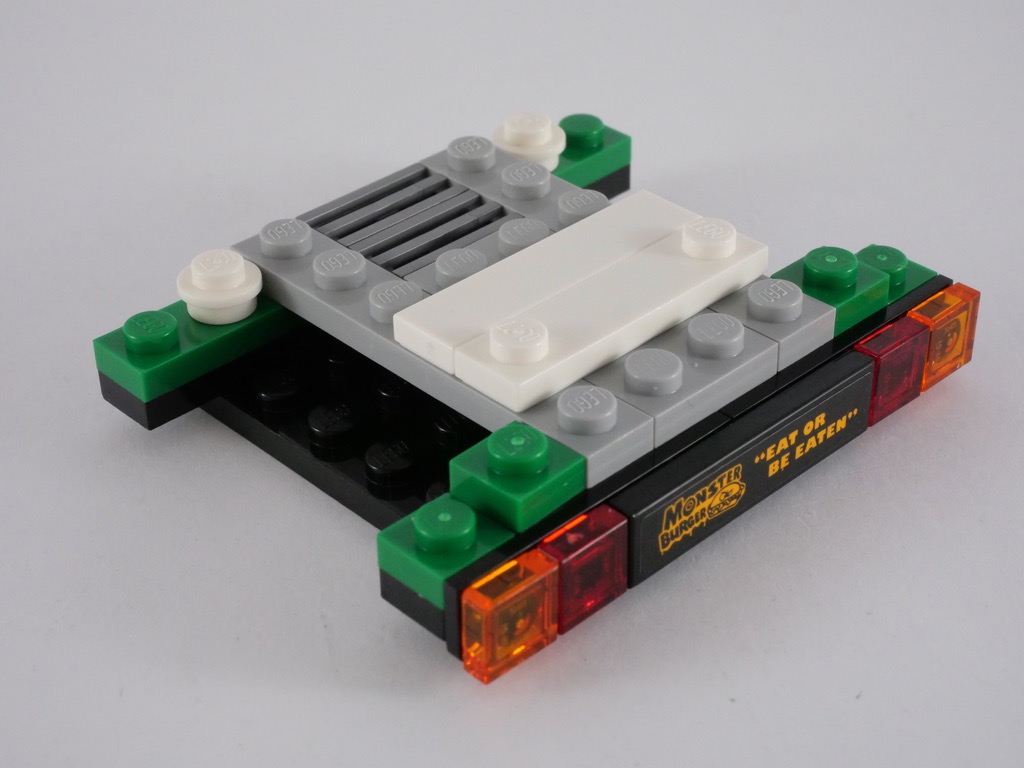 Avec le sachet de pièces suivant, on commence par assembler deux sous-ensembles. Le premier avec le moteur (en fait 4 pièces argentées), et le second avec une petite partie du plancher, viennent prendre place à l’avant et l’arrière de l’engin. Notez le sticker sur la plaque arrière avec la mention « Monster Burger – Eat or be eaten » plutôt rigolote.