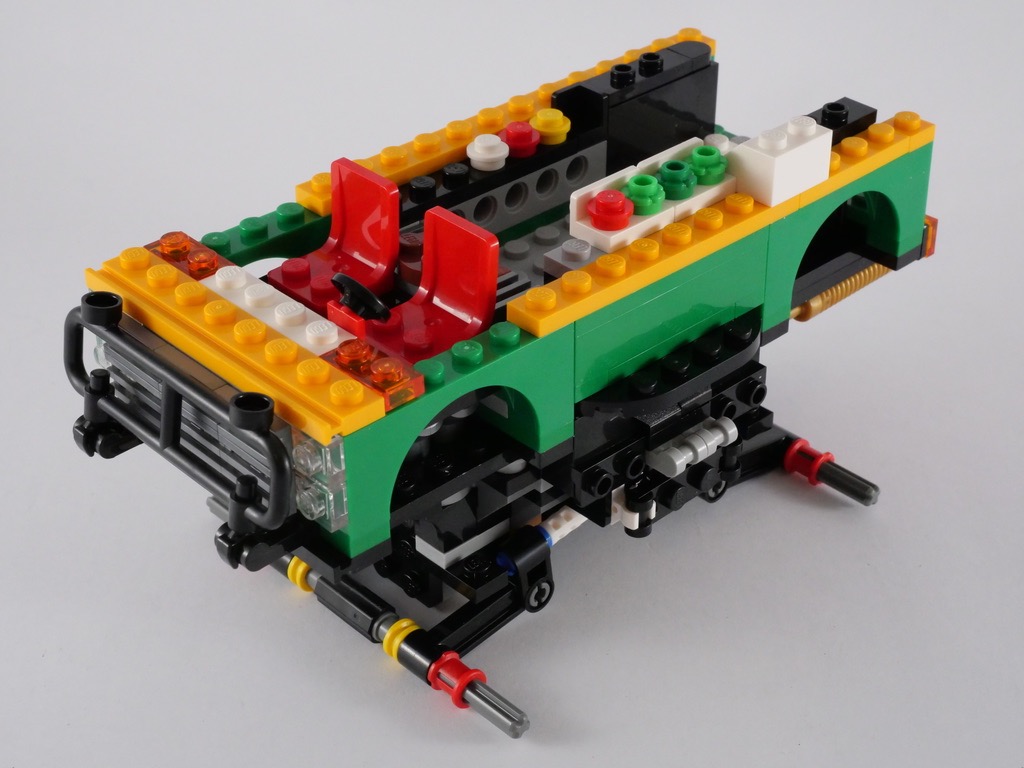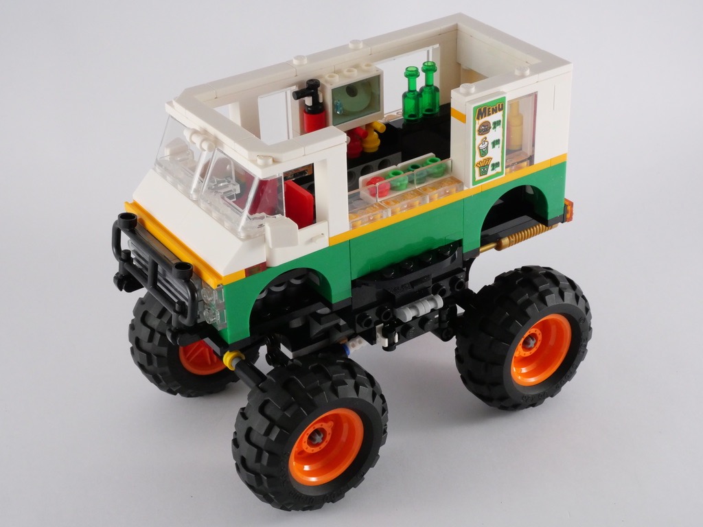 Ce sujet évacué, nous sommes ici en présence d’un set très sympathique, à commencer par ce que l’on attend principalement d’une boîte LEGO Creator : de la créativité ! Créativité qui se décline tout d’abord dans les techniques de construction employées. J’ai particulièrement apprécié le système d’escalier escamotable et la suspension de l’engin. Cette créativité se décline également dans le choix de l’engin réalisé : un monster truck qui vend des hamburgers 😉