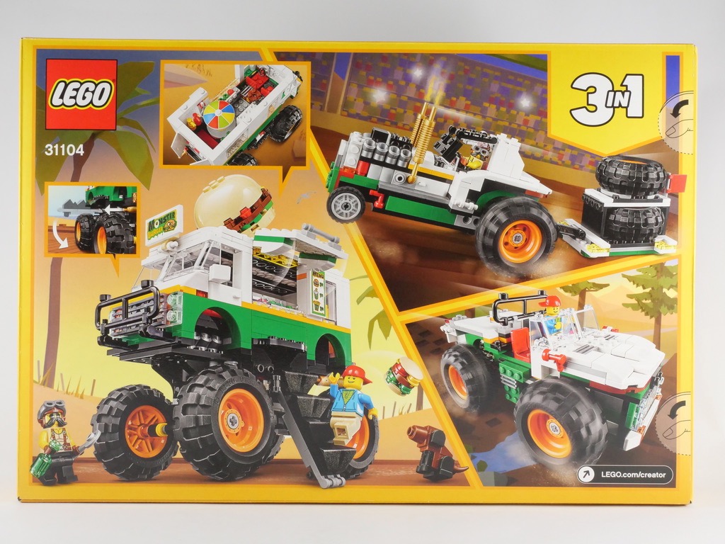 La boîte reprend le schéma habituel des sets de cette gamme. Le modèle « principal » occupe la majeure partie de la face avant, avec sur le côté droit une présentation des deux modèles alternatifs. Ici, notre « Monster Truck à hamburgers » est stationné au bord de la plage, dans un coin chaud à en juger par les palmiers présents en arrière plan. Au dos, nous découvrons celui-ci sous un autre angle, ainsi que des visuels des autres modèles mis en scène.
