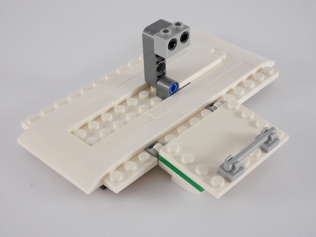 Petit point contrariant relatif à la jouabilité : l’escalier, une fois déployé, ne place pas les marches tout à fait à l’horizontale. Et celles-ci étant lisses, impossible d’y poser une minifig qui tombera inlassablement. Le seul endroit où l’on peut « poser » le client se situe juste au-dessous du comptoir, avec une toute petite corniche d’un tenon de large.