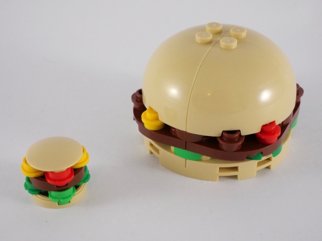 Ne reste que le toit à construire, assez simple dans sa conception. On notera simplement le petit sous-assemblage à base de pièces Technic qui supportera par la suite le hamburger géant. Hamburger que l’on assemble ensuite avec son petit frère. Une jolie construction plutôt inventive, où l’on devine les différents ingrédients sur la tranche. Qui m’a fait penser à la tranche de sandwich vue il y a quelques années dans le set 31050 Corner Deli.