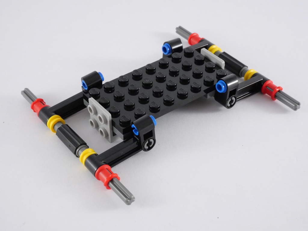 Nous passons alors au châssis. Celui-ci s’articule sur une plate 4×8 noire à laquelle sont fixés des pièces Technic en forme de L (Technic Pin Connector Perpendicular 2 x 4 Bent – Beam with 90 Hole Ø 4.8). Pièces qui recevront à leurs extrémités les deux essieux. L’avant et l’arrière sont reliés par une pièces flexible blanche, créant de manière novatrice une suspension et renforçant l’aspect tout-terrain.