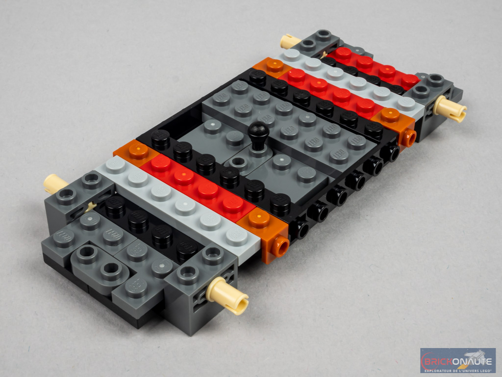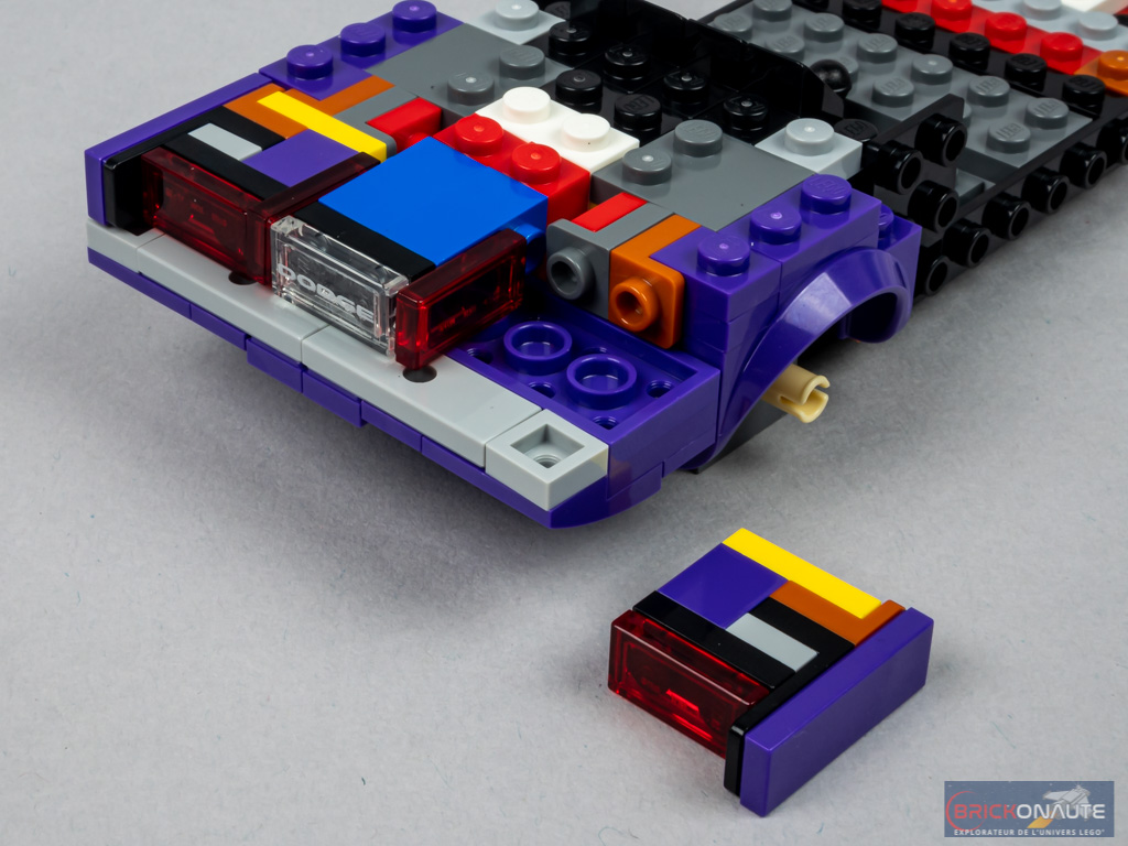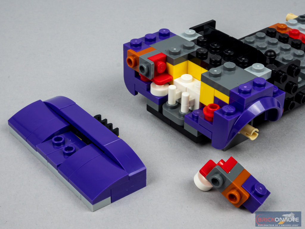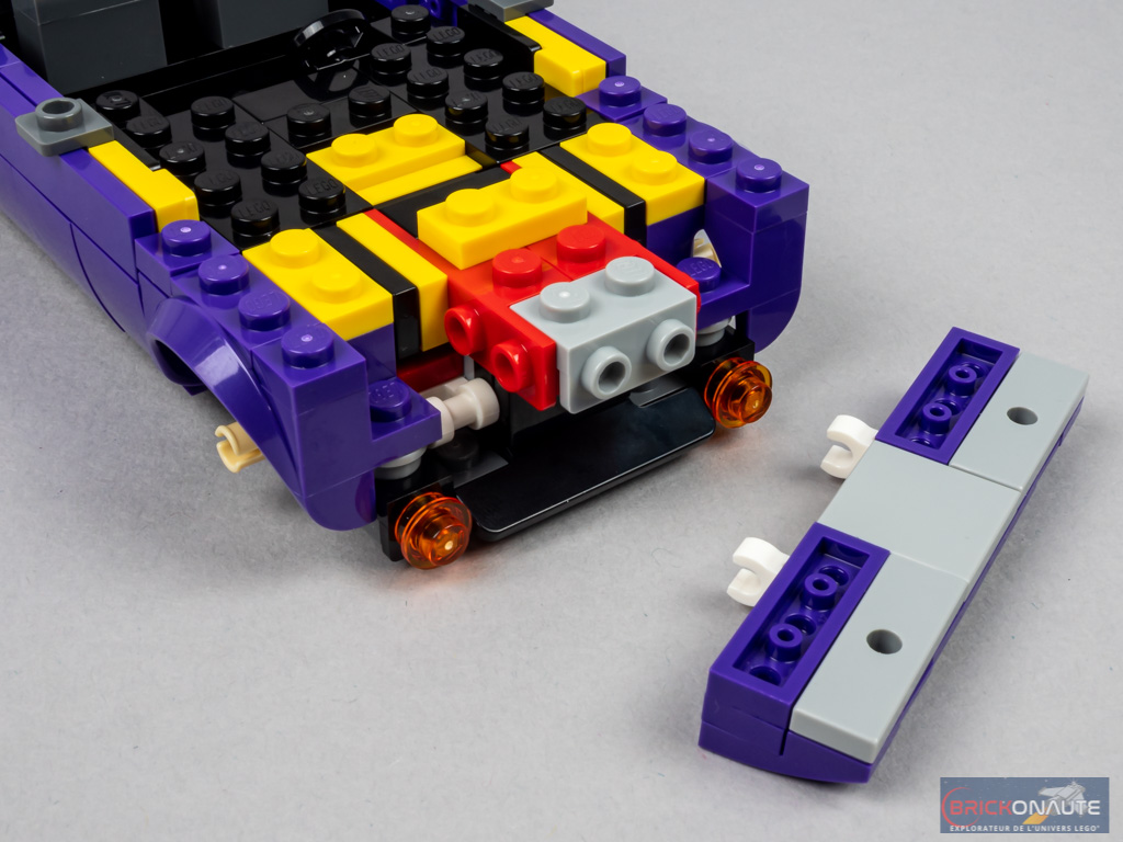 La deuxième voiture est basée sur le châssis que LEGO fournit depuis le passage de la gamme LEGO Speed Champions à 8 tenons de large. On l’allonge à l’avant et à l’arrière avec les deux essieux, et on aménage sommairement l’intérieur avec l’assise et un micro transformé en levier de vitesses. On s’intéresse à l’arrière avec les deux passages de roues et un savant assemblage d’éléments SNOT qui permettront, en partie basse, de clipser le bas de caisse. En partie haute, c’est du grand art avec 3 sous-assemblages distincts permettant une jolie reproduction des optiques de la machine. On finit l’arrière avec un petit « béquet » noir, quelques tiles violettes et les dossiers des sièges.