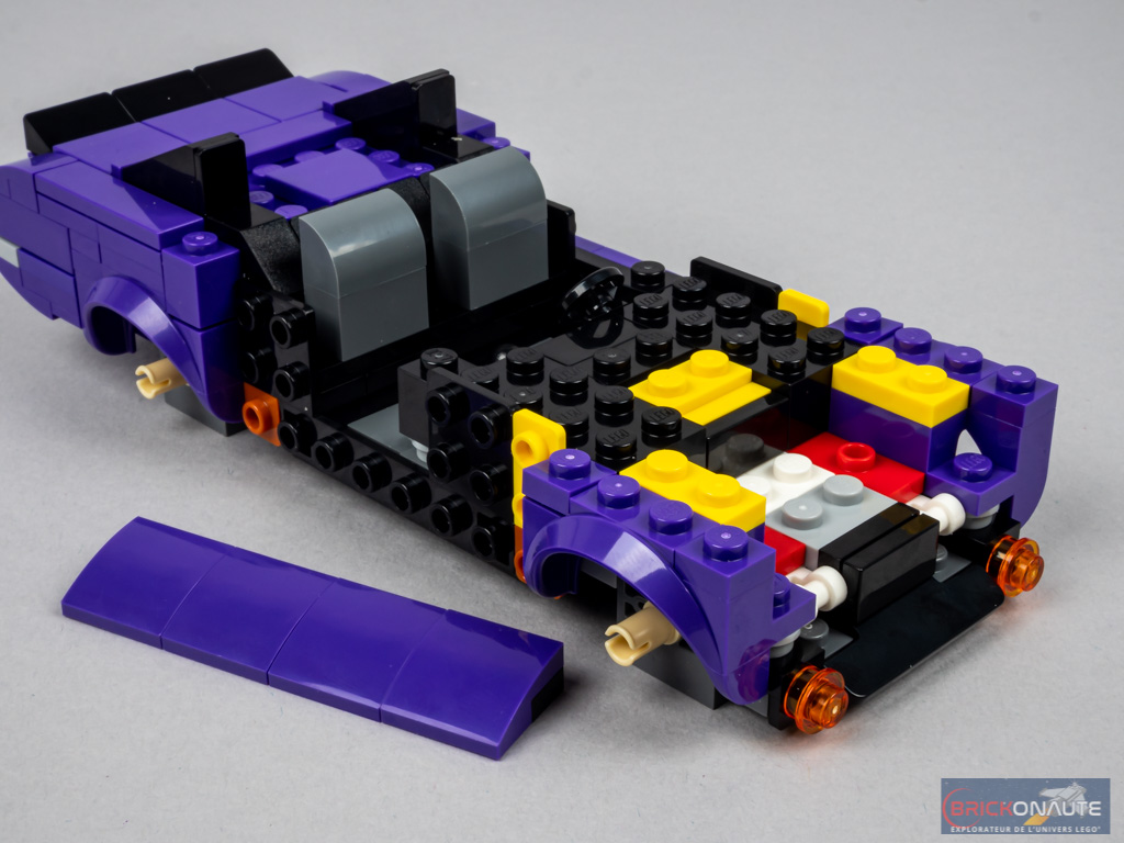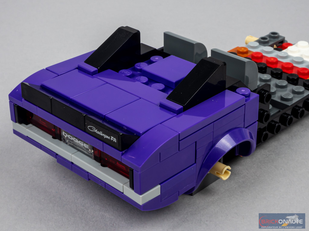 La seconde voiture est un bolide vintage, à la manière de celle trouvée dans le set 76903 Chevrolet Corvette C8.R Race Car and 1968 Chevrolet Corvette mettant à l’honneur une autre voiture américaine mythique. Ici, la Dodge nous est proposée dans une livrée violette – inspirée du Plum Crazy Purple de l’époque. Et c’est franchement sympa, en plus d’être original. Et comme le set 76903 – et même si notre dragster est plutôt sympa – j’ai une préférence pour cette seconde voiture. Il faut aussi dire que ses formes plus « carrées » se prêtent plutôt bien à une interprétation en LEGO.
