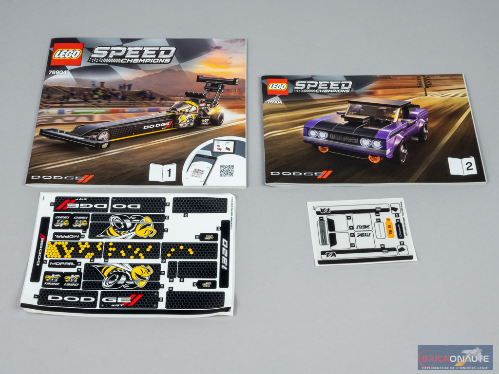 À l’intérieur, nous trouvons 4 sachets de pièces et 2 notices d’instructions. À la manière du set 76903 Chevrolet Corvette C8.R Race Car and 1968 Chevrolet Corvette, les autocollants de la Dodge de 1970 sont transparents et relativement peu nombreux. La planche d’autocollants prévue pour le dragster est nettement plus impressionnante, et il faudra redoubler de vigilance pour aligner tout ceci correctement.