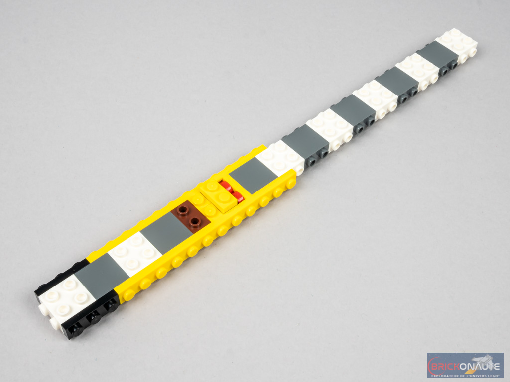 On ébauche l’arrière de l’engin en l’allongeant très légèrement, avant de recouvrir la partie inférieure de la machine de grandes tiles jaunes apportant la rigidité nécessaire à la tenue de l’ensemble. L’immense « capot » est fixé sur deux clips, et est donc légèrement incliné. Il est temps de repasser à l’arrière, avec un assemblage de briques SNOT et autres clips qui permettront la fixation des différents éléments – ce qui achève le 1er sachet de pièces.