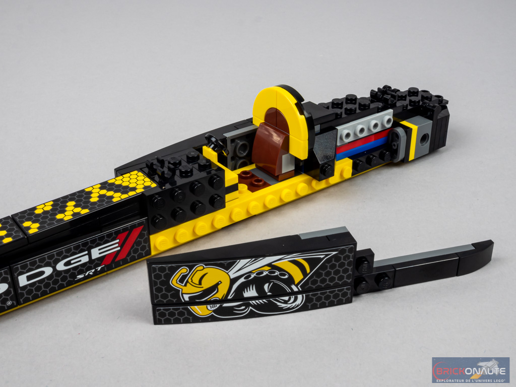 C’est logiquement Leah Pritchett qui prend place au volant du dragster – même si LEGO n’en fait pas état officiellement. Comme tous les sets de la gamme LEGO Speed Champions désormais, les minifigs sont fournies avec un casque et une chevelure, et les longs cheveux blonds de la jeune femme font nécessairement penser à la pilote de l’Angry Bee. Sa combinaison est superbe, avec des coutures et des liserés jaunes se prolongeant jusque sur les jambes, sans oublier le logo Dodge des deux côtés.