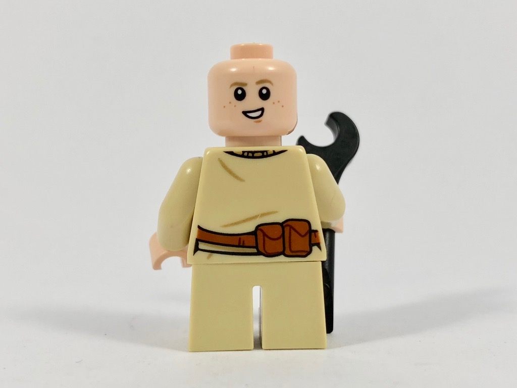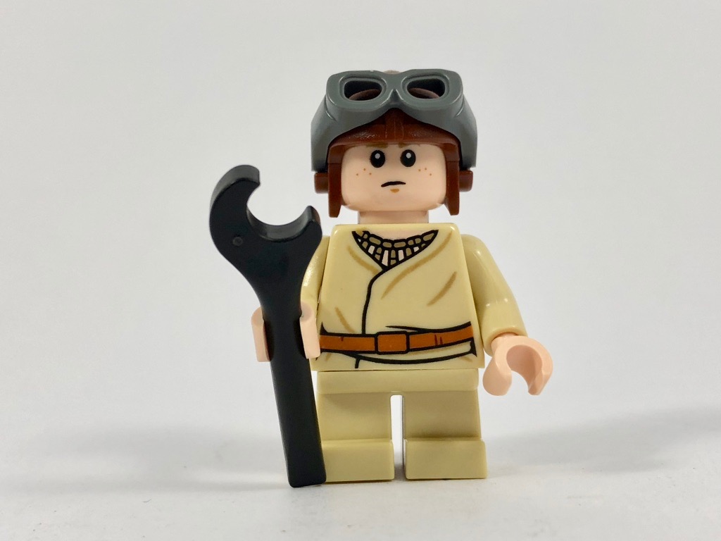 Nous avons ici une seule minifig, R2-D2 étant réduit à sa plus simple expression : seule sa « tête » est présente dans la boîte, et dépasse du vaisseau. La version d’Anakin Skywalker jeune telle qu’on la trouve ici est, pour le moment, exclusive à cette boîte. Les jambes sont monochromes, et le torse est tampographié des deux côtés. C’est relativement simple mais propre et bien exécuté, depuis les plis de la veste jusqu’aux poches de la ceinture apparaissant dans le dos. Nous avons également droit à un double visage : l’un sérieux, l’autre souriant. On appréciera les tâches de rousseur, les sourcils et le petit pli de la peau sous la bouche, c’est très bien réalisé également. Anakin porte sur la tête son « casque » de pilote en cuir et ses lunettes.