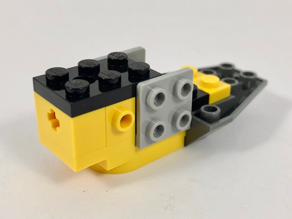 Une quinzaine de minutes suffisent à assembler le micro vaisseau. On commence par la partie centrale où se situe le poste de pilotage. La queue du vaisseau est fixée grâce à un axe Technic.