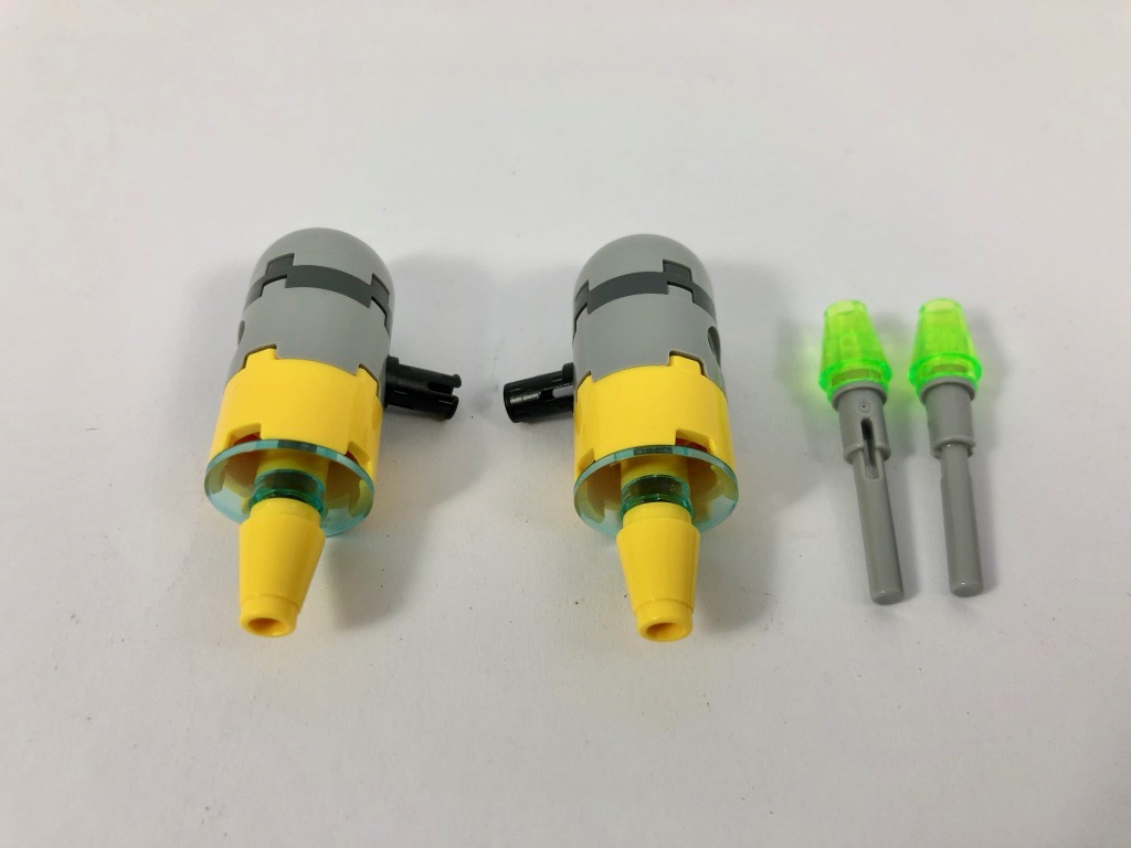 On ajoute ensuite les deux « réacteurs », articulés autour d’une barre et fixés au reste du vaisseau par un pin Technic. Ne reste qu’à ajouter les deux flick fire missiles (ces projectiles que l’on éjecte d’une pichenette) et R2-D2 (enfin juste sa tête, pour être plus précis).