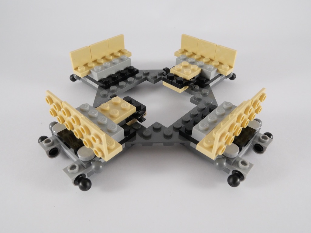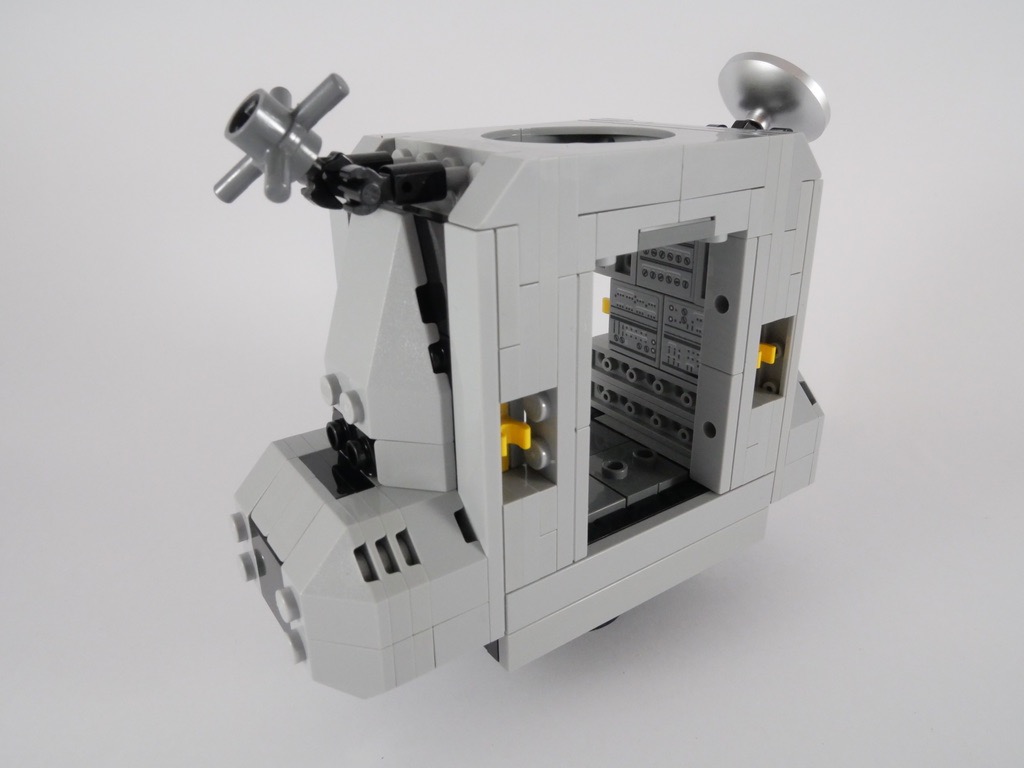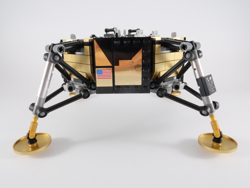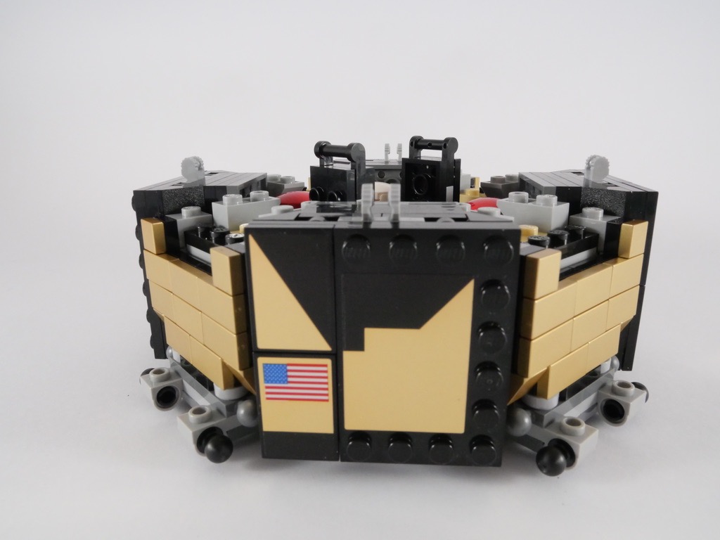 Il s’articule autour d’une pièce octogonale (Plate Octagonal 10X10) sur laquelle on commence par ajouter quatre excroissances pour former une croix. On ajoute un peu de structure interne et notamment les 4 réservoirs (de carburant et d’oxygène, comme nous l’explique un petit encart dans la notice). Puis on construit les 4 « quadrants », les faces du module situés entre les pieds de celui-ci. On commence par deux d’entre eux qui ne recèlent rien de particulier, tandis que le 3ème contient la caméra ayant filmé les premier pas de Neil Armstrong, et le 4ème le réflecteur permettant désormais de mesurer la distance Terre-Lune. On termine ce 2ème sachet de pièces par l’application de nombreux autocollants sur deux des quatre quadrants.