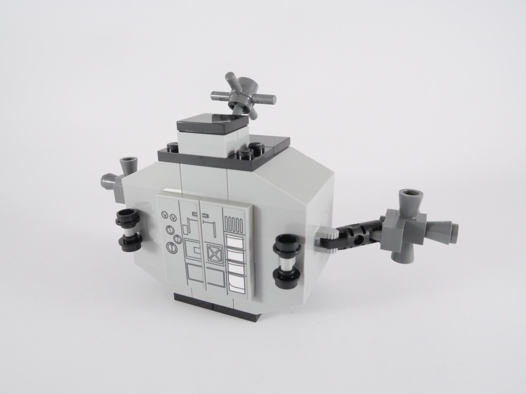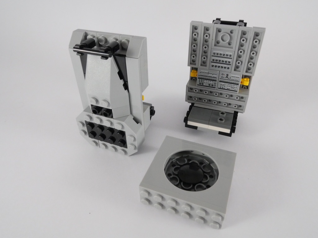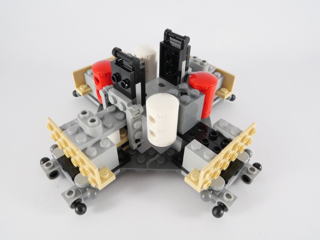 La construction, justement, est un régal. Si l’on oublie l’étape toujours fastidieuse d’application des autocollants si on veut obtenir un résultat convaincant. Les techniques sont variées, et la conception des 3 éléments (la base et les deux modules) est à chaque fois différente. Entre les constructions « hors grille » pour 4 des 8 côtés du module de descente, les techniques SNOT (pour Studs Not On Top) à foison, les systèmes de fixation alternatifs à base de ball joints… Il y en a pour tous les goûts. On se prend régulièrement à se dire que les pièces LEGO, c’est quand même vachement bien fait pour s’ajuster de cette manière !