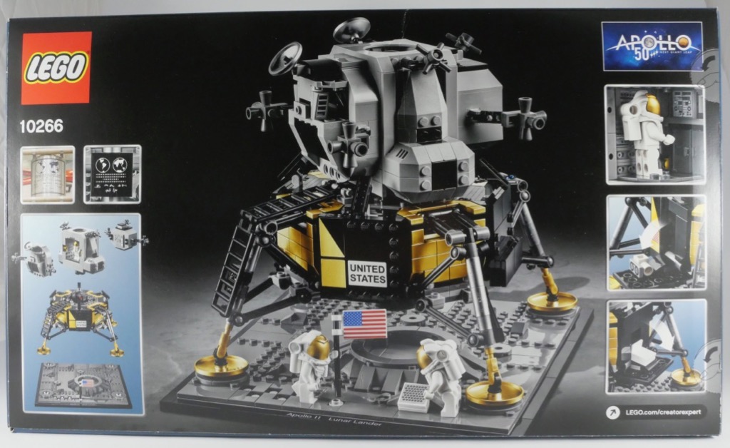 Sur la face avant de la boîte, Neil Armstrong est déjà sur le sol lunaire tandis que Buzz Aldrin s’apprête à le rejoindre. On aperçoit un « quartier de Terre » en arrière plan. Sur le côté droit, LEGO nous montre la possibilité de décomposer le set en 3 morceaux : le sol lunaire, l’étage de descente et l’étage de remontée. Une autre vignette nous indique les dimensions de l’engin : 20cm de large pour autant de haut. On trouve également le logo du 50èeme anniversaire de la mission Apollo 11. Au dos de la boîte, nous trouvons une photo du set sur sa « base d’exposition » (le sol lunaire) et quelques vignettes nous montrant les principales fonctionnalités.