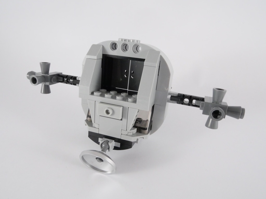 La construction de ce 3ème et dernier élément est également très intéressante. Ce module se décompose en 3 parties distinctes, on commence par assembler le milieu. On y retrouve quelques panneaux de commande (des autocollants) et des tenons apparents permettant d’y installer les 2 astronautes. La construction est très intéressante et mélange diverses techniques permettant de placer les pièces dans le sens voulu. 4 clips jaunes (2 de chaque côté) permettent de recevoir les autres morceaux du module. On construit le « cockpit » (si on peut l’appeler ainsi), qui dispose d’un panneau de commande et d’une trappe de sortie, puis l’arrière du module qui se résume à un gros bloc gris. On ajoute évidemment quelques antennes et réacteurs pour décorer tout çà.