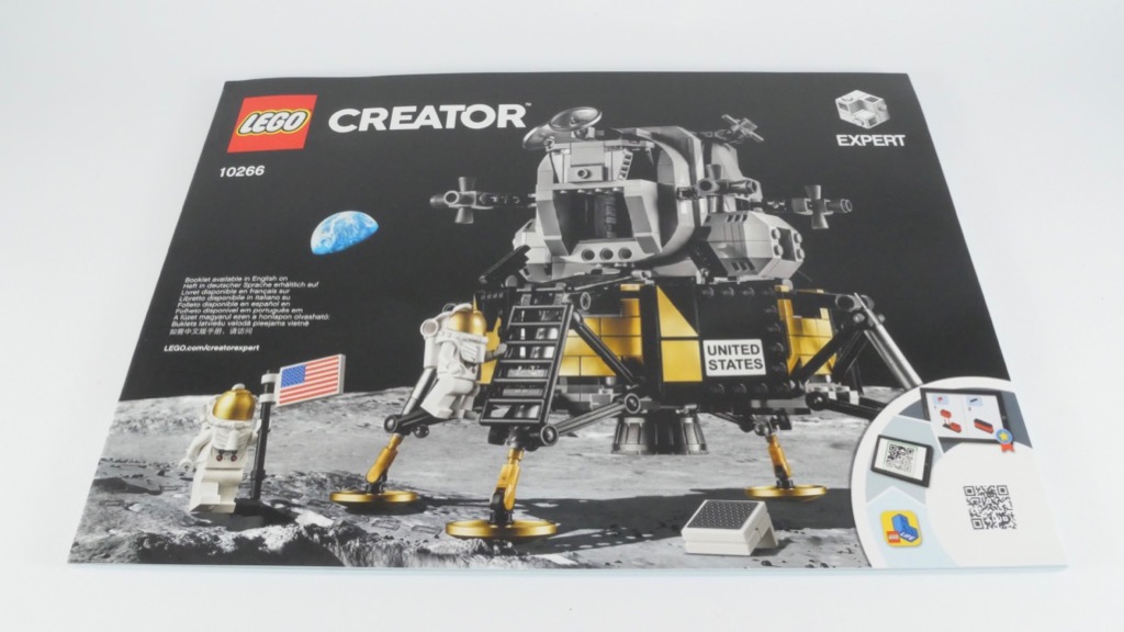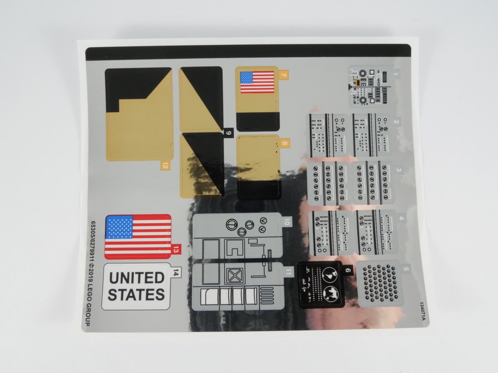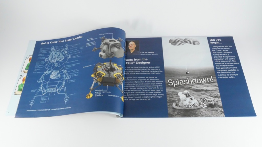 À l’intérieur, nous trouvons 8 sachets numérotés de 1 à 4 et un neuvième non numéroté, une notice d’instructions de 124 pages pour 178 étapes de construction, et une planche de 18 autocollants. Au début de la notice, on trouve une douzaine de pages sur l’histoire de la mission Apollo 11 et sur la génèse de ce set LEGO, accompagnées de jolies photos. Au fil des étapes de construction, quelques encarts nous donnent également d’autres détails et informations intéressantes.
