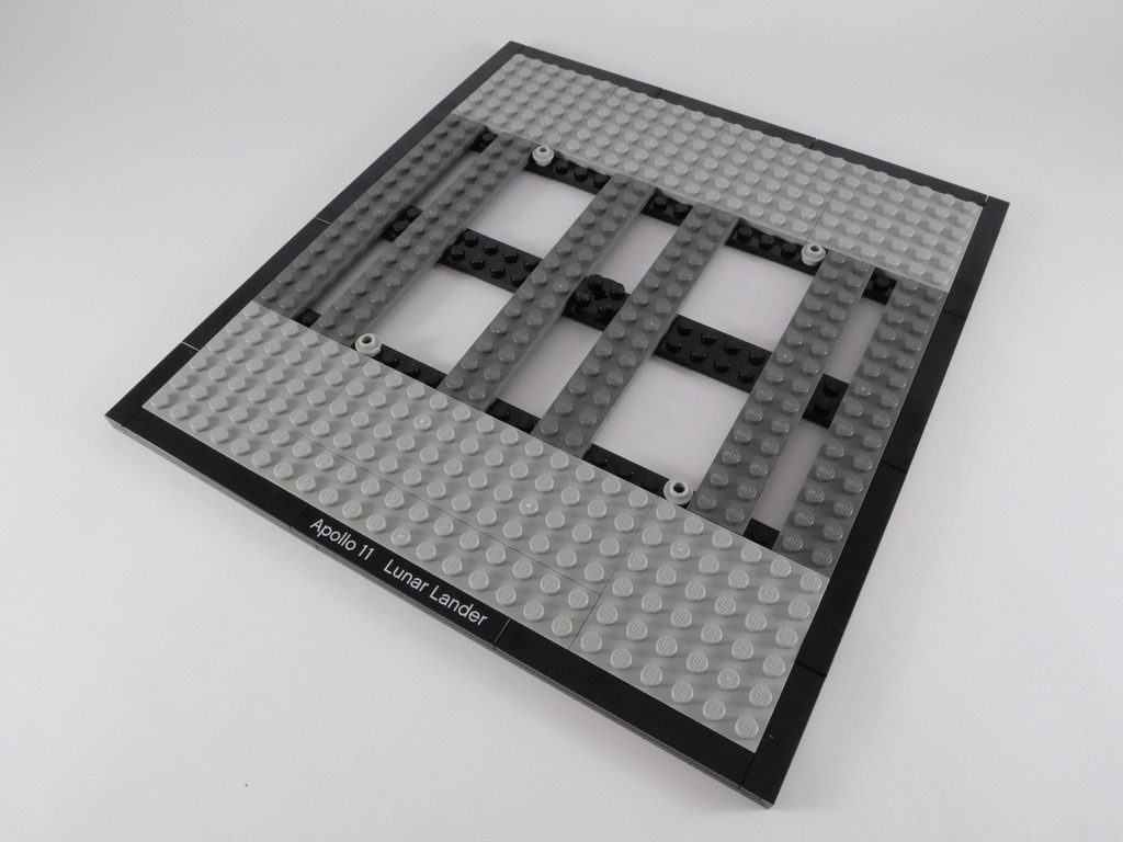 La construction débute par la base d’exposition, qui représente une portion du sol lunaire. D’une certaine manière, sa construction m’a fait penser aux sets de la gamme LEGO Architecture : une base, entourée de tiles noires, avec le nom du monument (ici du module) tampographié sur une tile noire. Après avoir assemblé la base, elle est surmontée d’un sol lunaire couleur dark bluish gray. Les traces de pas de l’astronaute sont représentées par quelques tenons plus clairs, tout comme le fond du petit cratère. On apporte un peu de relief avec quelques cheese slopes disposées çà et là. Dommage que le drapeau américain ne soit pas tampographié : il s’agit d’un simple autocollant.
