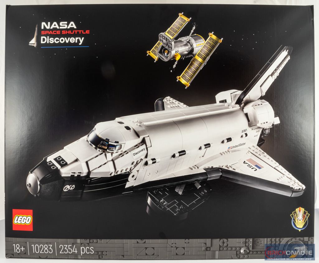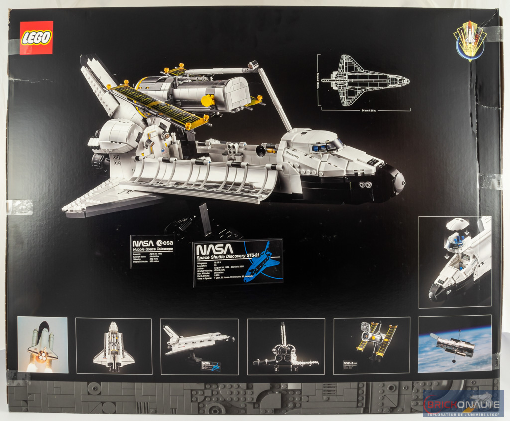 Nous y sommes désormais habitués avec la gamme LEGO « 18+ » destinée aux collectionneurs adultes : la boîte adopte une belle livrée noire, avec dans sa partie inférieure un bandeau précisant le numéro de set et le nombre de pièces. La navette y est présentée sur son support d’exposition, Hubble volant à ses côtés. Un petit logo arborant une navette et la mention Space Shuttle Program, accompagné des dates 1981 – 2011 nous donne une idée de ce que commémore ce set : les 50 ans du programme américain STS (pour Space Transportation System) et les 10 ans de la fin de celui-ci. La navette spatiale Discovery a pour sa part effectué son premier vol le 30 août 1984.
