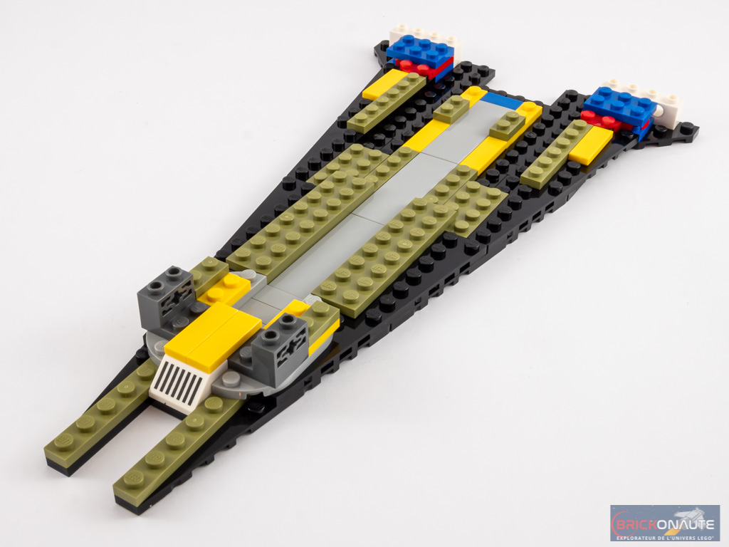 L’étape suivante m’a un peu rappelé la construction du set 76161 1989 Batwing, que j’ai pu tester pour vous il y a peu. Nous allons construire quatre sous-ensembles qui formeront les bords d’attaque des ailes. Il s’agit essentiellement de slopes grises ou noires disposées en vis-à-vis. Les deux premiers sous-ensembles, les plus longs, prennent place à l’avant. Les deux autres sont installés sur la partie la plus large des ailes. On comble l’espace à cet endroit et on rigidifie l’ensemble avec deux grandes wedges bleues.