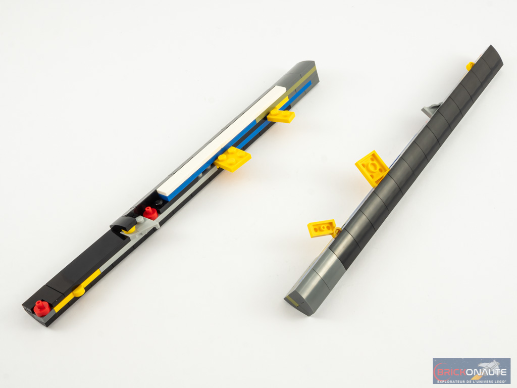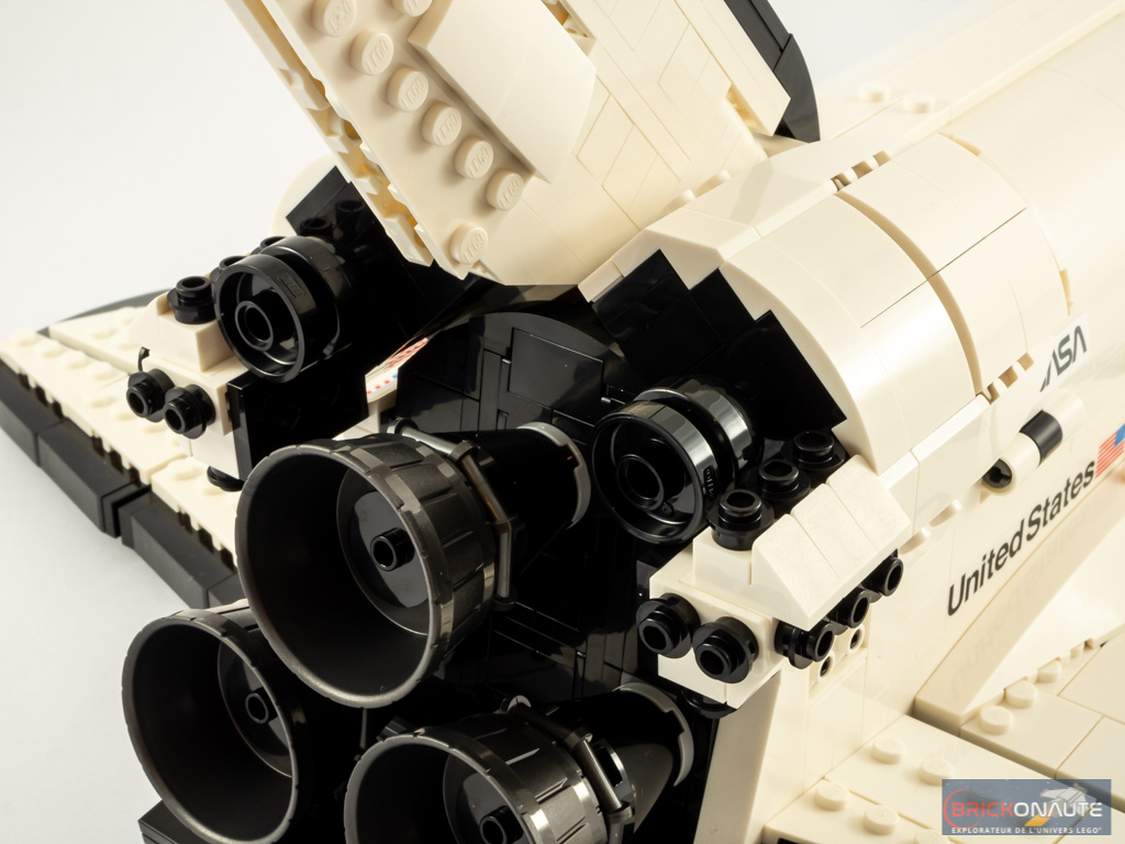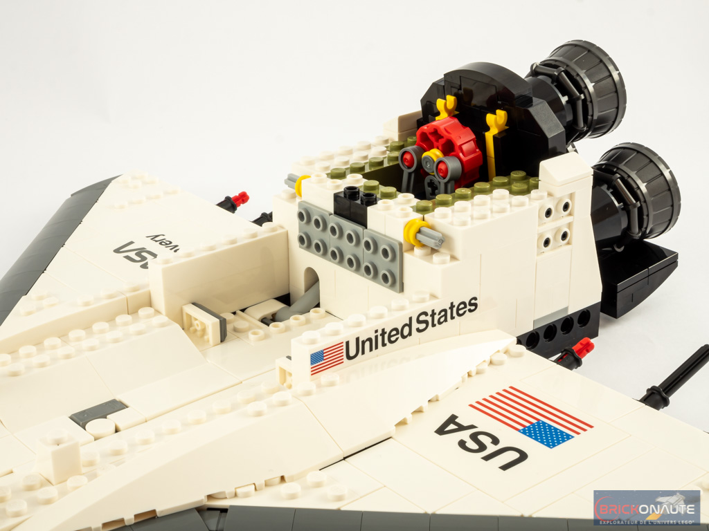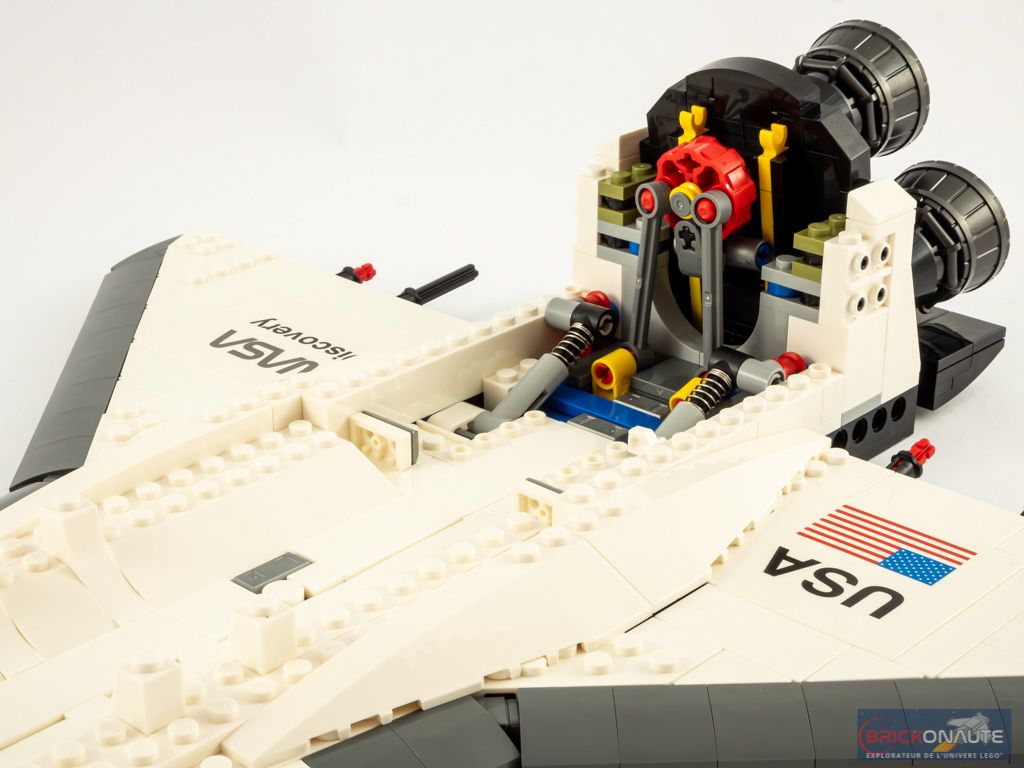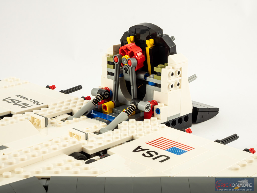 On bloque alors les deux ressorts reliés aux trains d’atterrissage arrières afin qu’une pression sur le volet principal les libère. On s’attarde ensuite sur l’arrière où on commence par construire une structure sur les deux côtés. On élabore alors un grand sous-ensemble noir duquel dépassent 3 axes Technic sur lesquels viendront se fixer les moteurs. L’un d’entre eux entraîne, en tournant, deux biellettes qui permettent de faire monter ou descendre les élevons. Ce sous-ensemble est positionné dans la structure construite précédemment et clipsé à la navette pour obtenir l’angle désiré.