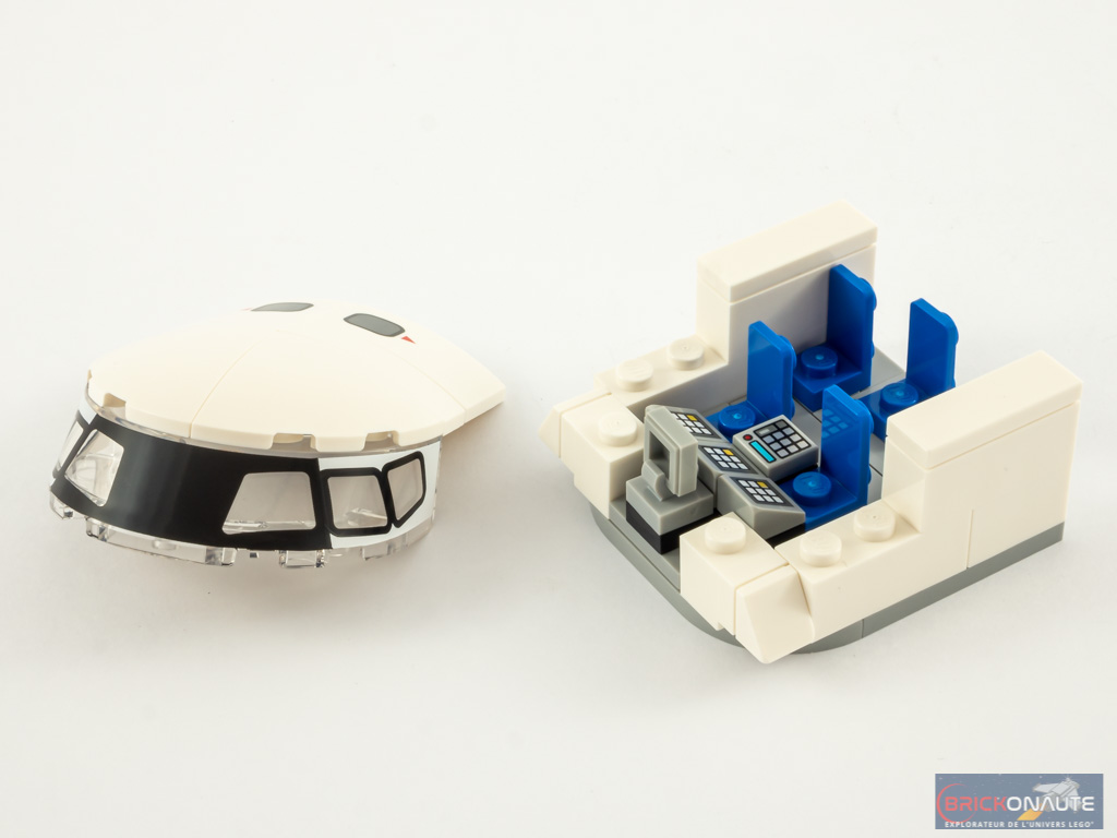 Mais mon vrai « grand » regret en termes de design, ce sont les 24 autocollants argentés à disposer sur la partie concave des portes de la soute de la navette. Ils ne sont franchement pas faciles à coller, et il en résulte quelques petits écarts. C’est d’autant plus dommage que la plupart des pièces sont tampographiées : hormis les autocollants des plaques signalétiques type « UCS », on ne recense que 4 autres autocollants. A ce titre d’ailleurs, le « pare-brise » (je ne sais pas s’il existe un terme particulier pour la navette) tampographié est absolument superbe.