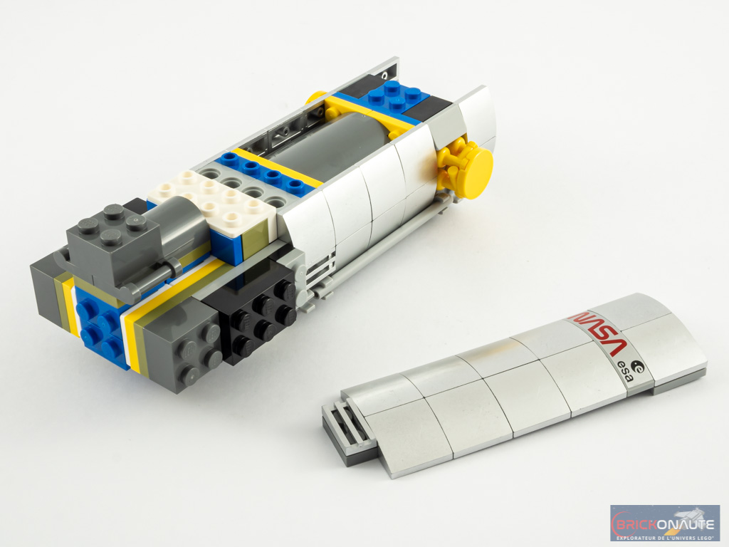 Bon, vous devez vous en douter à la lecture du chapitre précédent : je trouve cet ensemble particulièrement réussi. Le modèle est très impressionnant de détails, le designer allant jusqu’à utiliser le « tube » des pins Technic pour représenter certains des organes de manoeuvre. Rien ne dépasse, c’est vraiment « propre ». Et la même attention aux détails a été portée aussi bien sur la pièce « maîtresse » du set, la navette, que sur le télescope Hubble également très bien réalisé.
