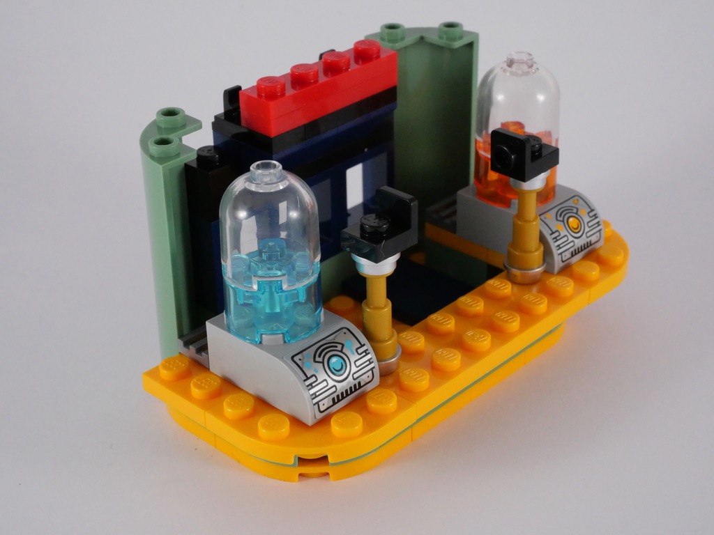 L’aspect général est sympa, et le code couleur retenu permettra de l’intégrer sans peine dans un décor constitué d’autres sets de la gamme. On trouve sur le comptoir 2 distributeurs de granités et quelques verres, mais l’intérieur est vide. L’arrière a été délaissé, tout juste y trouve-t-on 2 stickers laissant deviner le monstre qui se cache à l’intérieur.
