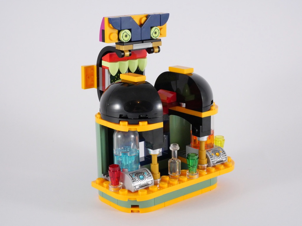 La construction prend une dizaine de minutes et est assez simple. On commence par le comptoir, avant d’ajouter les murs, puis la toiture et quelques boissons en guise de décor. On termine avec la partie mobile qui permet de dévoiler le monstre caché en soulevant le store.