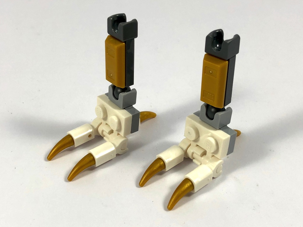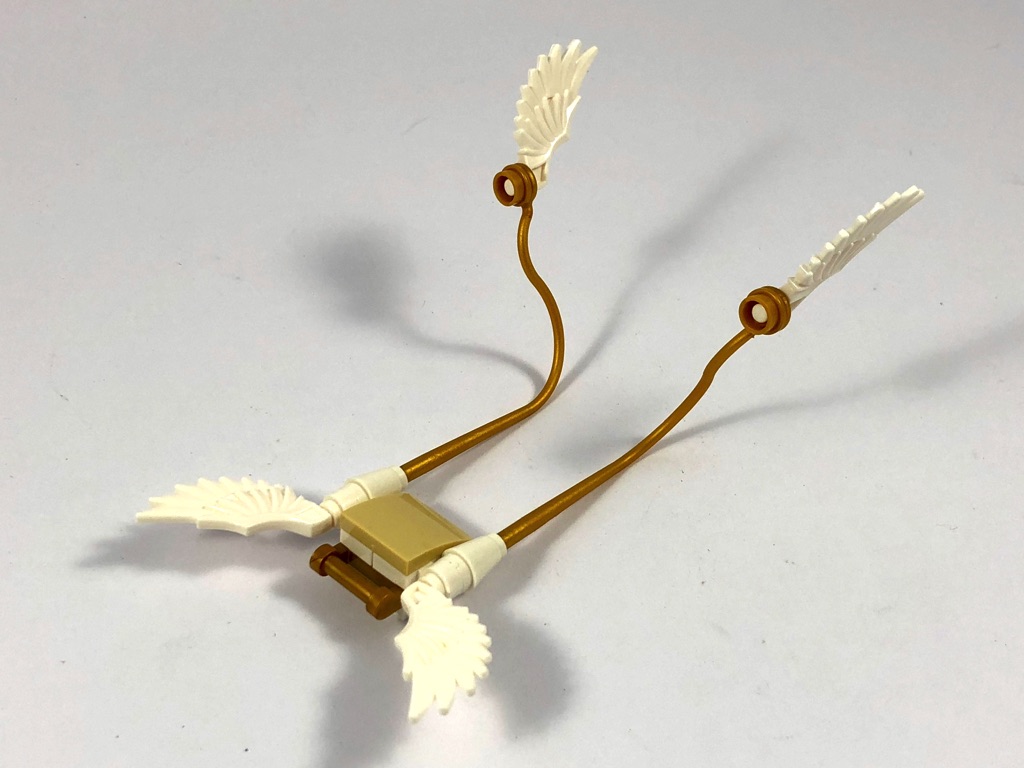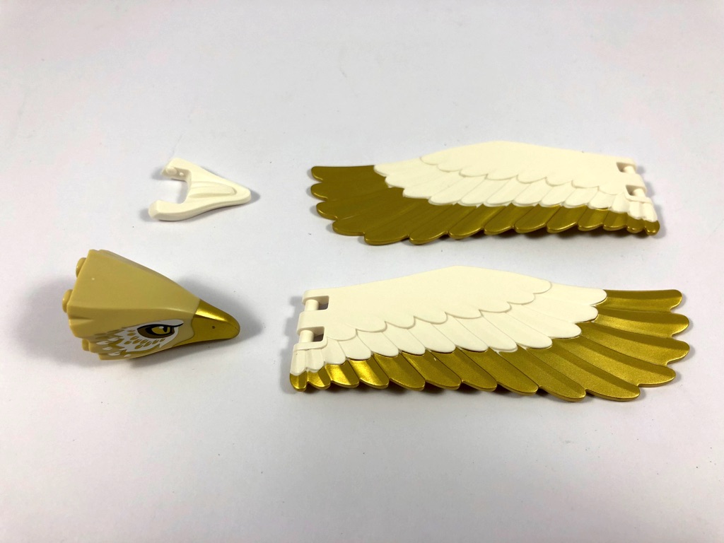 On commence par le corps de l’animal, composé de briques SNOT (Studs Not On Top) que l’on vient ensuite habiller. Deux stickers sont apposés sur le dessus pour représenter les plumes. La tête est pour sa part fixée sur un ball joint, tout comme les pattes dont les serres sont couleur pearl gold. L’arrière de l’oiseau est fixé grâce à deux clips. Quatre ailes blanches décorent le postérieur de l’animal, dont 2 fixées au bout de fouets couleur pearl gold, encore une nouveauté. Et, encore une exclusivité, les deux immenses ailes bicolores sont ajoutées afin de terminer l’oiseau. Carton plein pour ce deuxième animal qui, à l’instar du premier, offre une jouabilité maximale au prix de maigres concessions sur le design : tout est articulé.