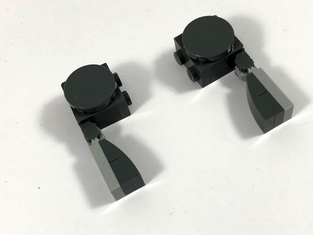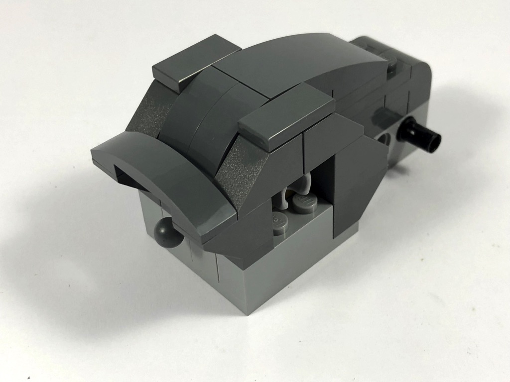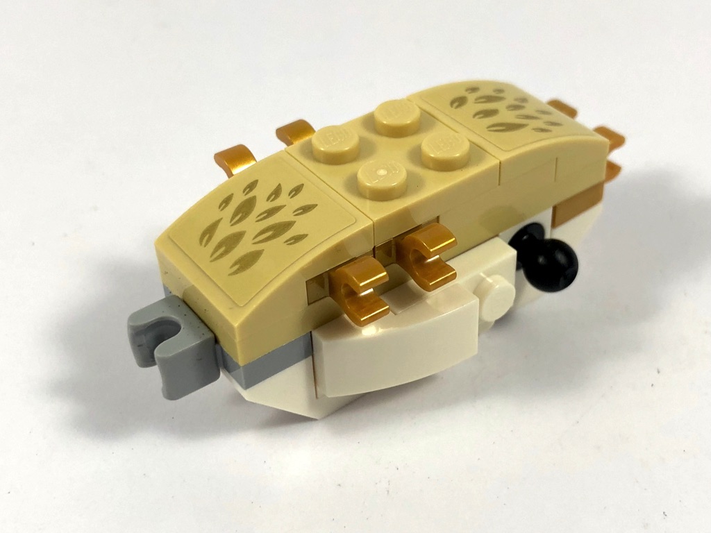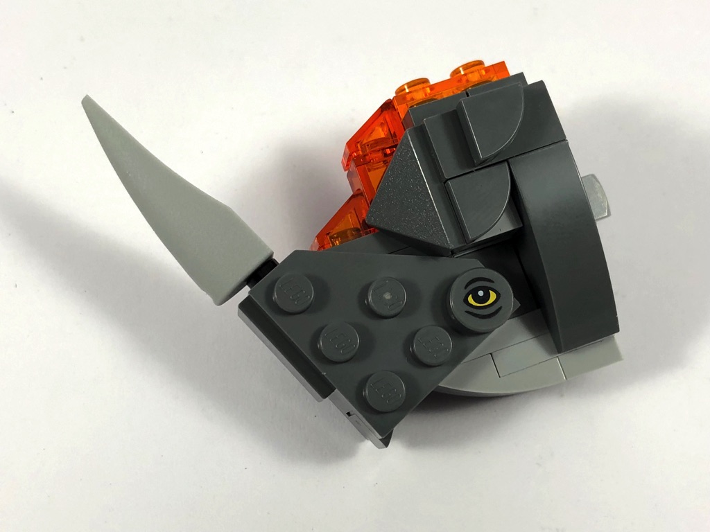 Nous démarrons ici également par le corps de l’animal. Autour de deux briques Technic, on assemble briques et slopes de couleur grise pour retrouver l’aspect massif du bestiau. On construit ensuite la tête, composée pour partie de briques en trans orange. Sa corne est une pièce flexible couleur light bluish gray (Barb Large Flexible [Claw, Horn]). La tête est fixée sur un ball joint au reste du corps. On termine la bête avec ses 4 pattes. Les deux pattes avant sont fixées sur des pins Technic, et les avant sur des ball joints également. Nous avons un troisième animal très réussi. Au niveau design, nous retrouvons vraiment l’animal massif vu dans le premier volet des Animaux Fantastiques. Et au niveau jouabilité, il est également totalement articulé, rien à redire.