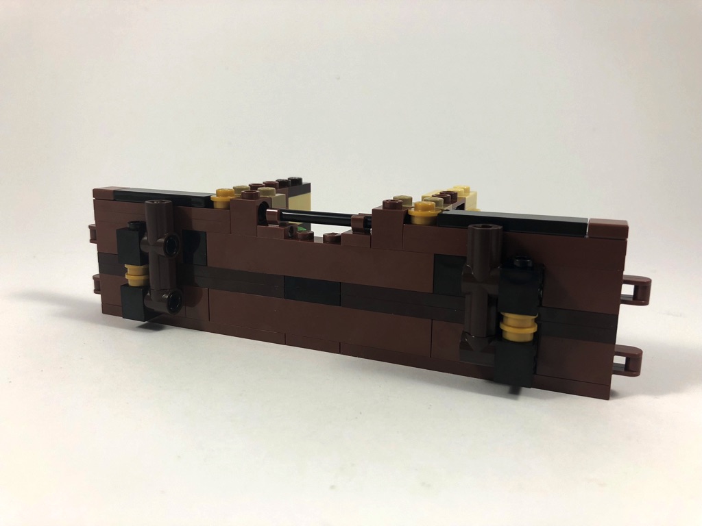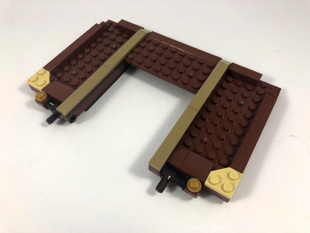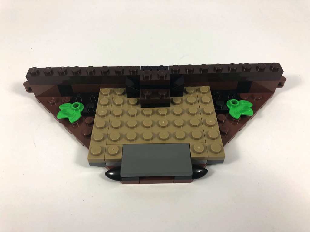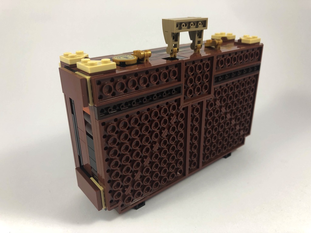 Vous l’avez compris : il ne reste désormais qu’à construire le « couvercle » pour refermer la valise. Il est assez simplement constitué de plates couleur reddish brown, décorées de quelques tiles dont certaines en tan. Des pièces Technic permettent de fixer les deux morceaux de la valise ensemble. La construction se termine avec l’ajout de quelques pièces pour décorer les coins de la valise. À la manière des différents étages des bâtiments modulaires, la valise reste fermée grâce à quelques tenons.