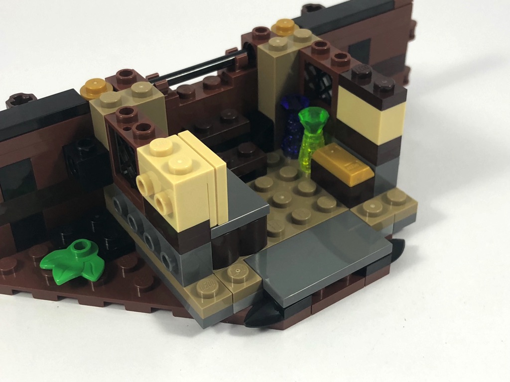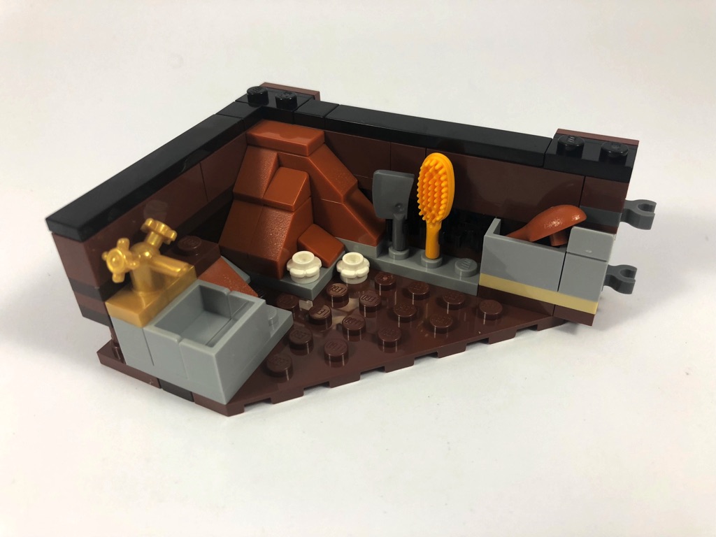 À la partie centrale construite précédemment s’attachent deux moitiés représentant deux zones de l’univers contenu dans la valise de Norbert. Ces deux parties sont fixées à la partie centrale par des clips, il est donc possible d’ouvrir ensuite complètement la valise. La première partie est une aire de toilettage pour les animaux fantastiques de Norbert. On y trouve ainsi un lavabo avec un robinet et quelques accessoires. Mais il semble que ce soit également le coin cuisine : un hachoir au mur et une cuisse de dinde tendent à le prouver. Sur l’extérieur, une tile dorée est décorée d’une serrure avec l’inscription Muggle worthy : Norbert peut présenter sa valise à un contrôle de Moldus sans risquer de se faire prendre 😉
