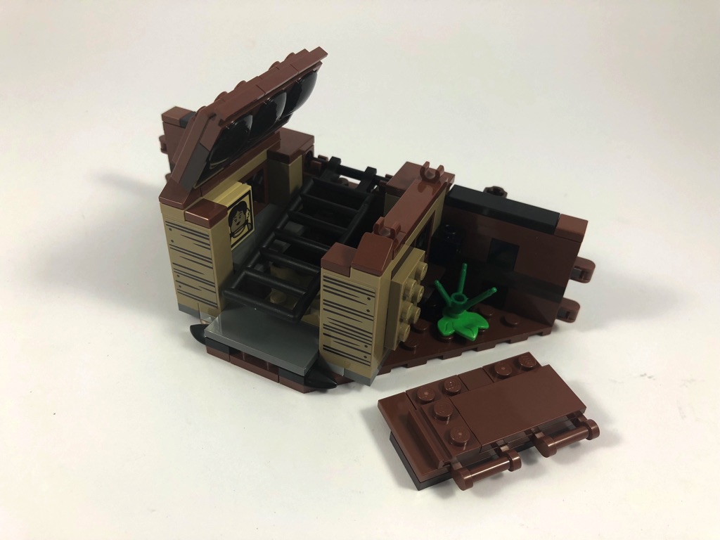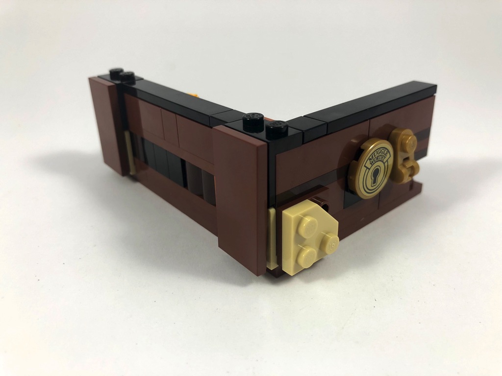 Le deuxième manuel d’instructions, et les sachets numérotés 3 et 4, servent à la construction de la valise. Celle-ci commence par la partie centrale. Sur une base de forme trapézoïdale, nous commençons par construire un escalier venant de l’échelle donnant sur l’extérieur (ladite échelle sera ajoutée plus tard). Des fixations à base de pièces Technic sont ajoutées sur la tranche afin de pouvoir ensuite ajouter l’autre moitié de la valise. Cette partie centrale est en fait la « maison » de Norbert Dragonneau. On y ajoute ensuite quelques potions, une table, un portrait et deux fenêtres. On la termine avec l’échelle qu’il est possible de laisser pliée à l’intérieur, et par le toit, en deux moitiés articulées qu’on peut ouvrir pour accéder à l’intérieur, ou fermer pour que la valise en soit une.