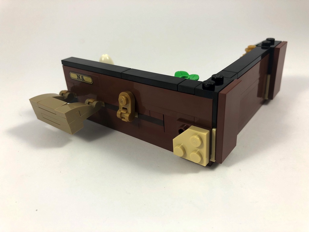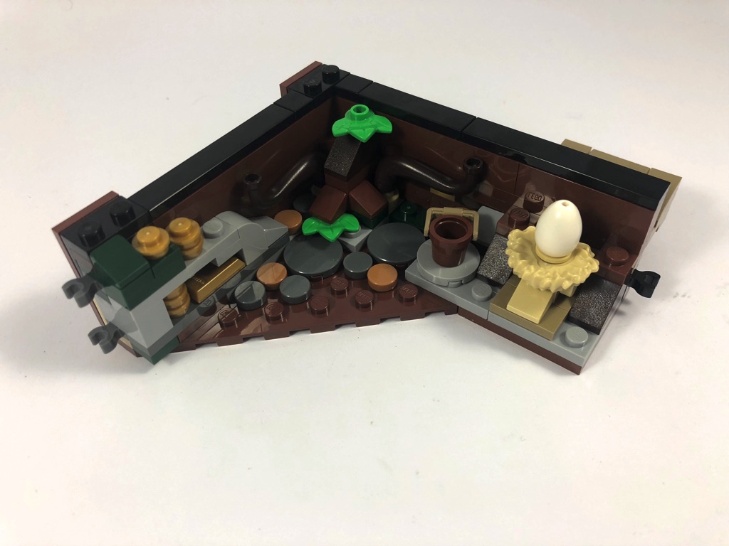 Nous attaquons avec la deuxième saynète le quatrième et dernier sachet de pièces. La base est quasiment identique, quoiqu’un peu plus longue. On devine qu’on est en extérieur avec un sol joliment décoré de round tiles de tailles et couleurs différentes. Un nid et un oeuf d’Occamy sont ajoutés, ainsi qu’une poignée de pièces dorées et un lingot pour le Niffleur. Côté extérieur, on trouve cette fois une étiquette avec les initiales de Norbert Dragonneau (N.S. pour Newt Scamander en VO). On ajoute également la poignée à la valise. On fixe ensuite cette saynète à la partie centrale, et on referme le tout : les deux zones sont également reliées entre elles avec un clip.