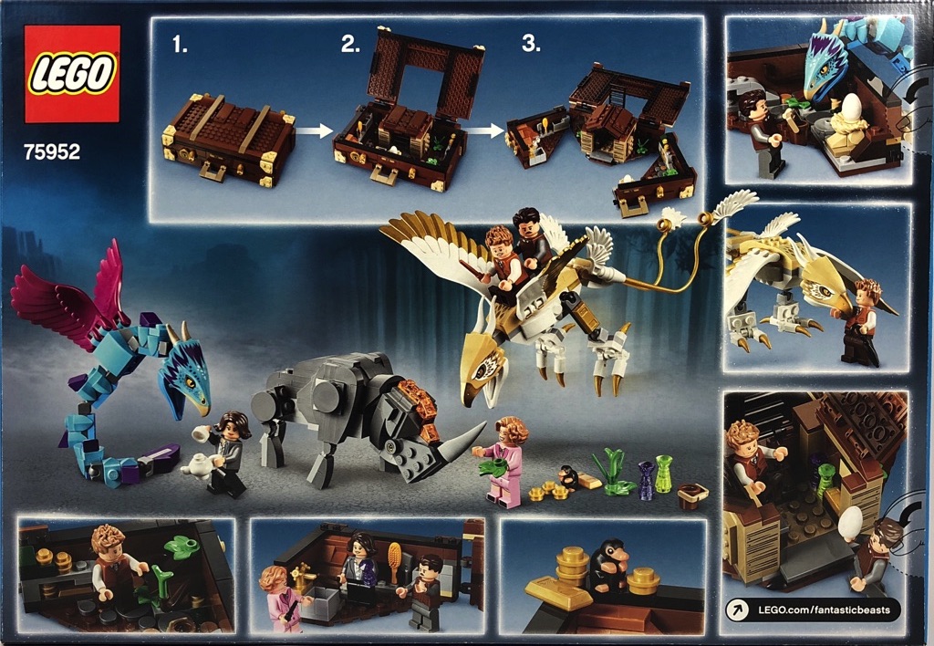 Nous sommes en possession d’une boîte de la gamme LEGO Fantastic Beasts : cela nous est rappelé non seulement par le logo, mais également par la présence d’une photo dans le coin supérieur droit, avec Tina Goldstein, Norbert Dragonneau et son Niffleur. Alors que la valise est présentée fermée dans le coin inférieur droit aux côtés du logo « Wizarding World » (qui englobe tout ce qui touche de près ou de loin à l’univers Harry Potter), elle est ouverte sur l’image principale. On y observe Tina en train de nourrir un Occamy, Queenie un Oiseau-Tonnerre, et Jacob coursé pour un Eruptif. Norbert sort de sa cabane avec son Niffleur à la main. Les 4 minifigs nous sont également présentées dans le coin inférieur gauche, et sur la partie supérieure de la boîte avec leurs accessoires respectifs. Au dos de la boîte, l’image principale présente les 3 animaux, tandis que les différentes vignettes qui l’entourent reviennent sur les principales fonctionnalités du modèle.