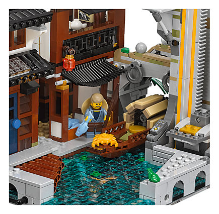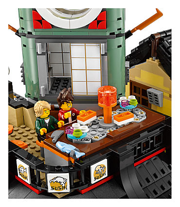 La ville NINJAGO® offre un nombre infini d’aventures ! C’est un modèle extrêmement détaillé dont les 3 niveaux sont reliés par un ascenseur coulissant. Le premier niveau présente un marché aux poissons traditionnel, une maison, un pont surplombant un cours d’eau et un bateau de pêche. Le deuxième niveau présente une boutique d’articles de mode, un magasin de BD, un restaurant de dégustation de crabes avec une fonction de « grillade de crabes » et un distributeur de billets automatique. Au sommet de la ville verticale se trouvent l’appartement de Garmadon et de Misako, un bar à sushis sur le toit avec tapis roulant, ainsi qu’une tour de radio. Cet ensemble dynamique inspiré de LEGO® NINJAGO LE FILM™ inclut également 16 figurines et Sweep, le robot de maintenance.