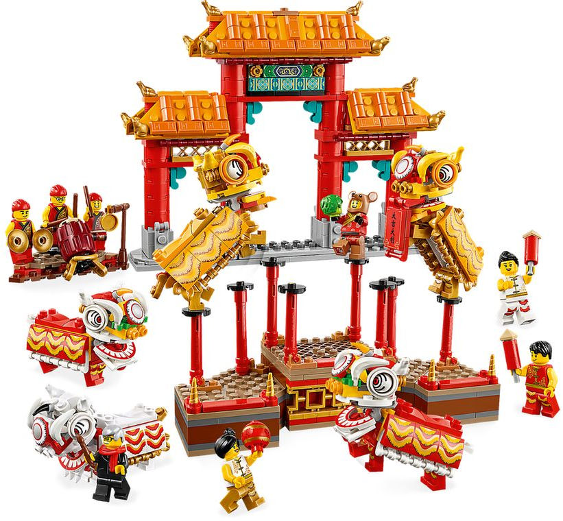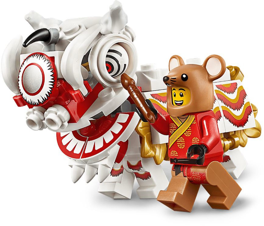 Il s’agit de la danse des lions, une célébration classique du nouvel an chinois. Au programme de cette première boîte : 5 figurines de lions, une scène pour les percussionnistes, un podium et une porte de temple. Sans oublier un total de 8 minifigs, dont une déguisée en rat, et un joli paquet d’accessoires traditionnels.