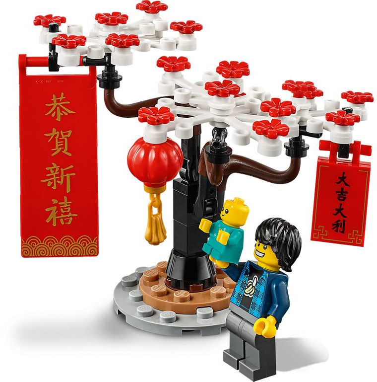 Cette seconde boîte reproduit la fête organisée dans de nombreuses villes chinoises à l’occasion des célébrations du nouvel an. On y retrouve un temple joliment décoré, un théâtre d’ombres avec des marionnettes ou encore de nombreux étals de nourriture et de souvenirs. LEGO nous fournit pas moins de 14 minifigs, dont la famille vue l’an dernier dans le set 80101 – Chinese New Year’s Eve Dinner. Et ici encore, ça fourmille de détails faisant référence à la culture chinoise : des décorations « Fu » porte-bonheur, des parchemins « meilleurs vœux », des moulins à vent en papier et des petits pains sur lesquels sont représentées des têtes d’ours.