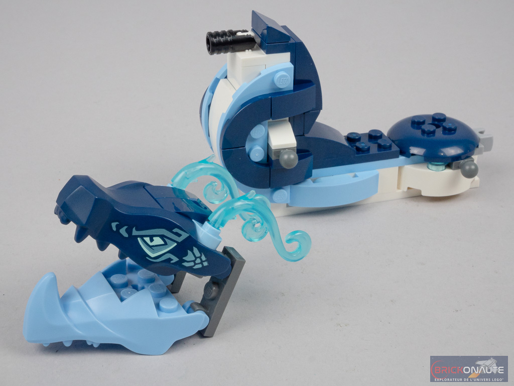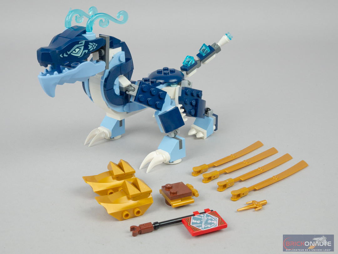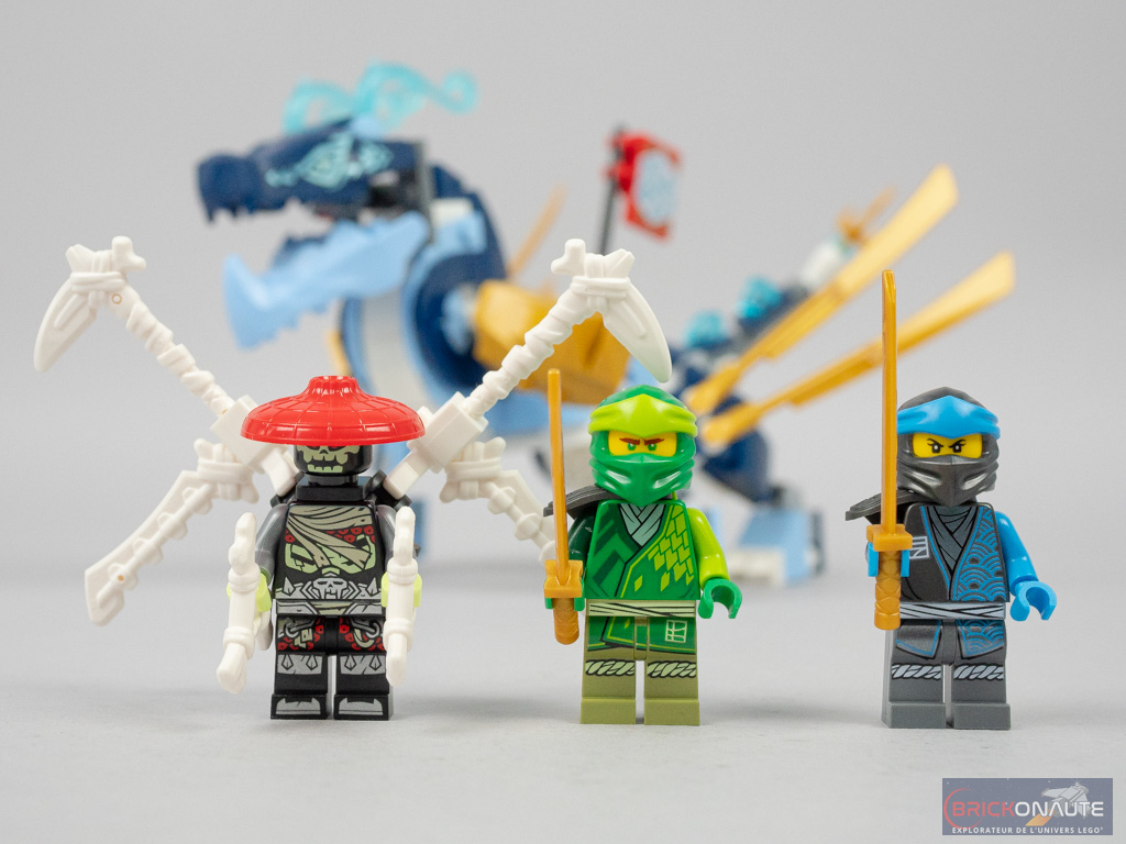 La petite boîte très colorée, mettant en scène le dragon d’eau surgissant d’une cascade, contient 3 sachets de pièces numérotés, un 4ème sachet non numéroté avec les accessoires du garde squelette, et une notice d’instructions de 88 pages. Elle est ponctuée d’illustrations mettant en scène le set, c’est très sympa.