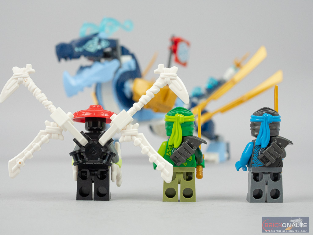 Petit aparté rapide sur les minifigs – au nombre de 3 ce qui est plutôt généreux pour une boîte à 20 €. Les deux ninjas sont présents dans des versions vues depuis début 2022, avec une très jolie tampographie du torse et des jambes, et des masques bi-injectés. Tous les deux ont un double visage, et disposent d’une épaulière avec un emplacement leur permettant de ranger leur katana dans le dos. Le méchant de service est un garde squelette (Bone Guard). C’est une recombinaison des éléments qu’on pourra trouver dans les sets de cette nouvelle vague de produits LEGO Ninjago, la tampographie est soignée mais un peu terne. Sa principale particularité : il dispose d’un backpack auquel sont attachées 4 lames squelettiques.
