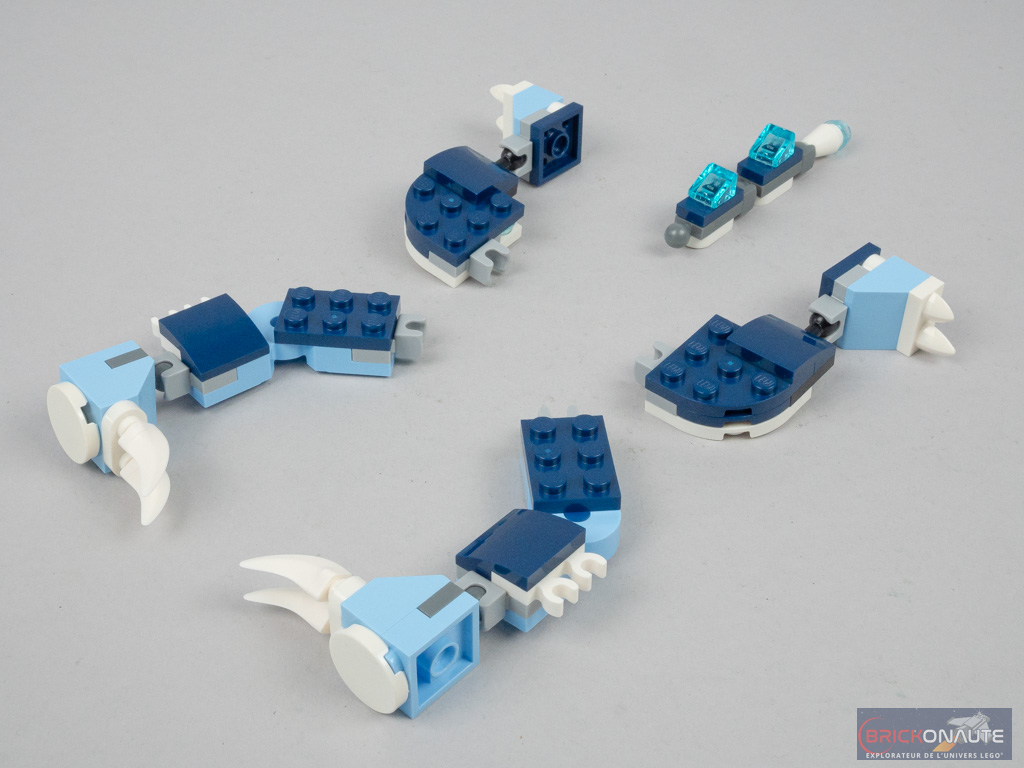 Pas de planche d’autocollant, c’est un bon début. L’inventaire proposé est honnête avec 173 pièces réparties en 83 références différentes. On appréciera également la présence d’éléments intéressants avec une jolie sélection de pièces couleur light royal blue (dont certains inédits jusqu’ici dans cette couleur), la tête tampographiée du dragon, et les quelques éléments dorés.