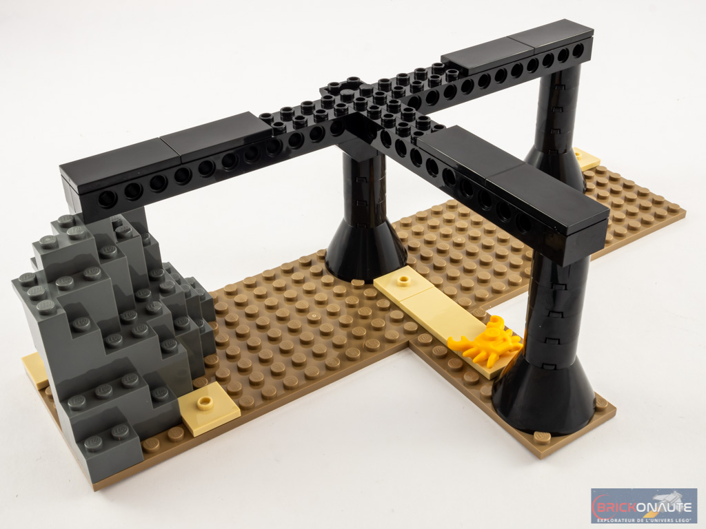 Nous attaquons le vif du sujet avec le 2ème sachet de pièces. Celui-ci nous permet d’assembler le support de la station. Des briques Technic sont posées entre 3 poteaux et un récif, et reçoivent quelques tiles sur lesquelles reposeront ensuite les éléments de la station.