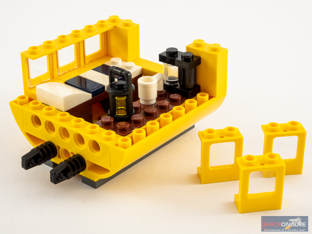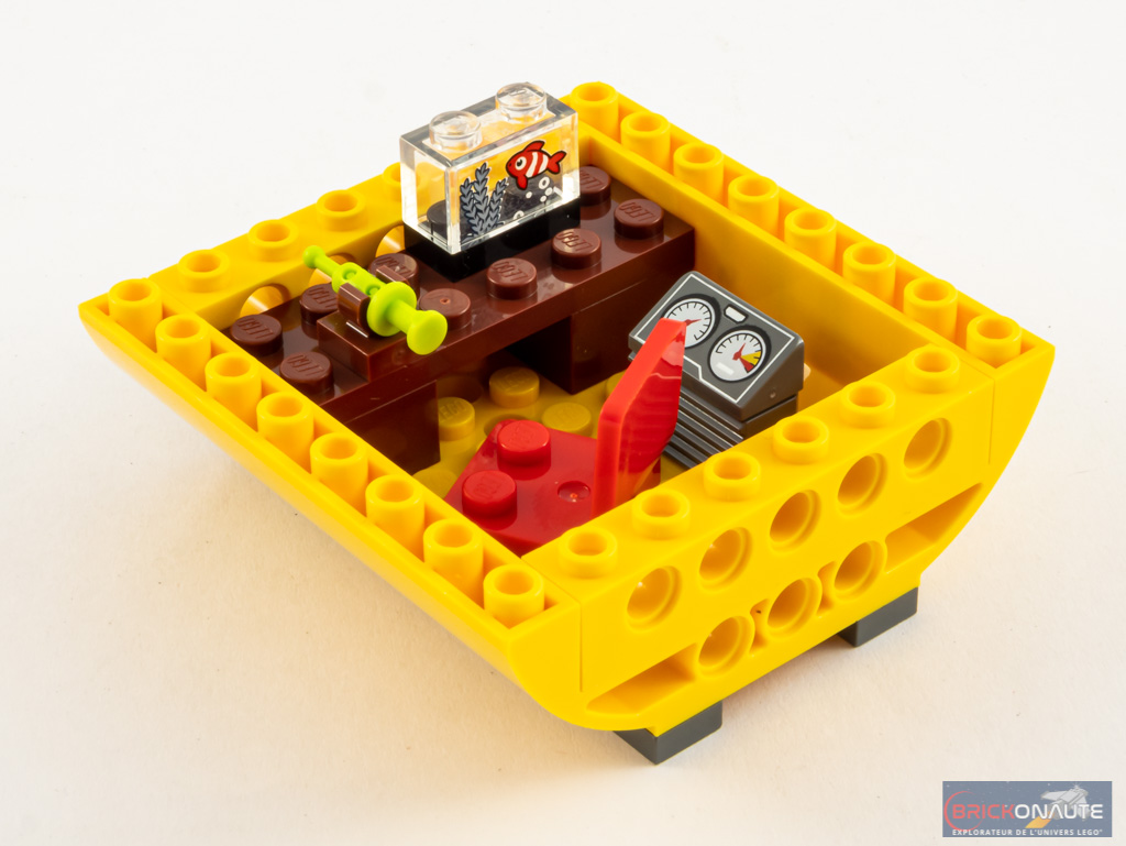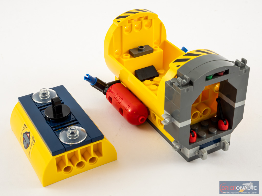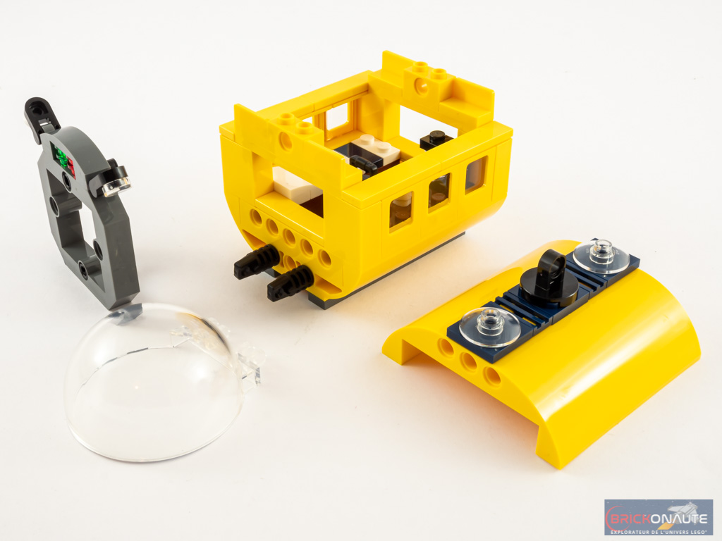 Le corps du sous-marin est monobloc et plutôt massif. Et malheureusement les deux extrémités sont fermées : il est donc impossible d’y pénétrer depuis le noyau, comme il est impossible pour l’opérateur de rejoindre son poste de commande. Hormis les deux manettes du poste de commande, l’intérieur n’est absolument pas aménagé. On termine la construction avec deux hélices, deux bras robotisés, le demi-dôme transparent et 6 spots disposés autour de ce dernier.