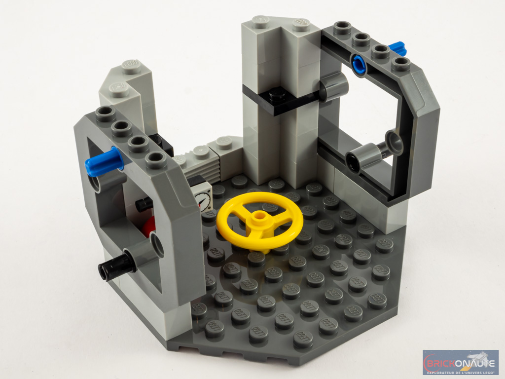 Le corps du sous-marin est monobloc et plutôt massif. Et malheureusement les deux extrémités sont fermées : il est donc impossible d’y pénétrer depuis le noyau, comme il est impossible pour l’opérateur de rejoindre son poste de commande. Hormis les deux manettes du poste de commande, l’intérieur n’est absolument pas aménagé. On termine la construction avec deux hélices, deux bras robotisés, le demi-dôme transparent et 6 spots disposés autour de ce dernier.