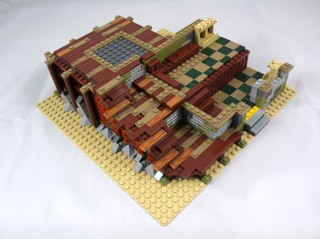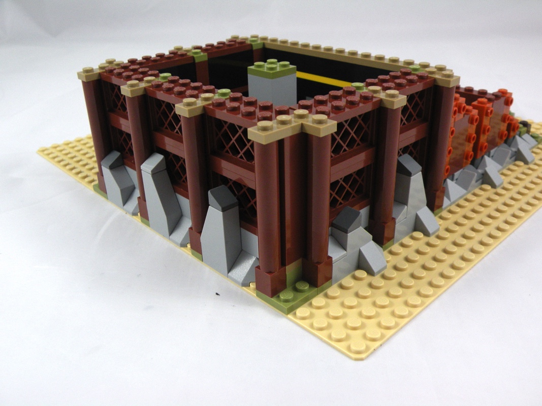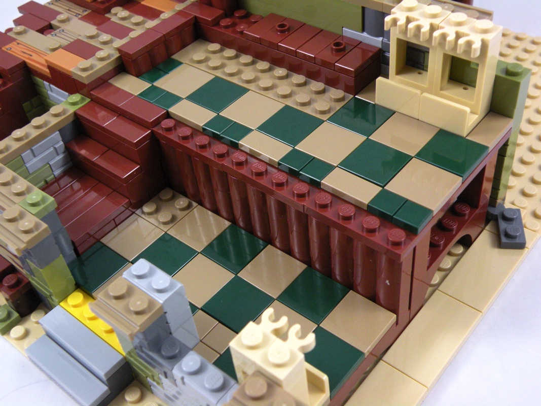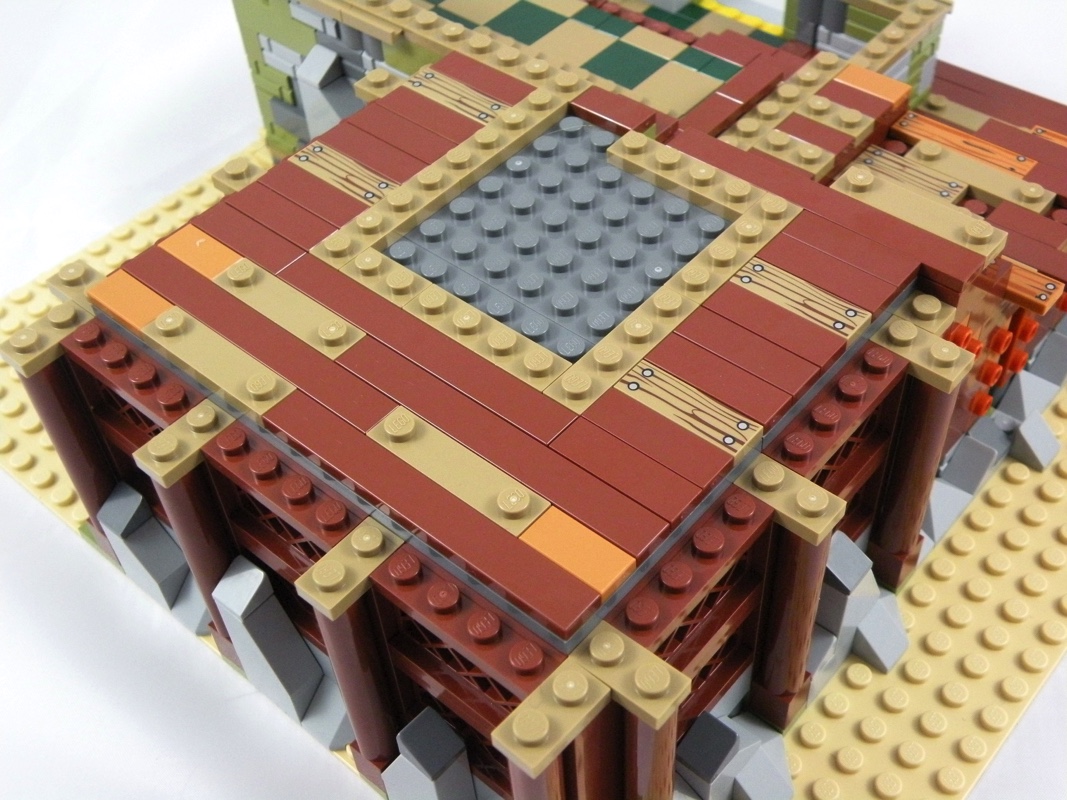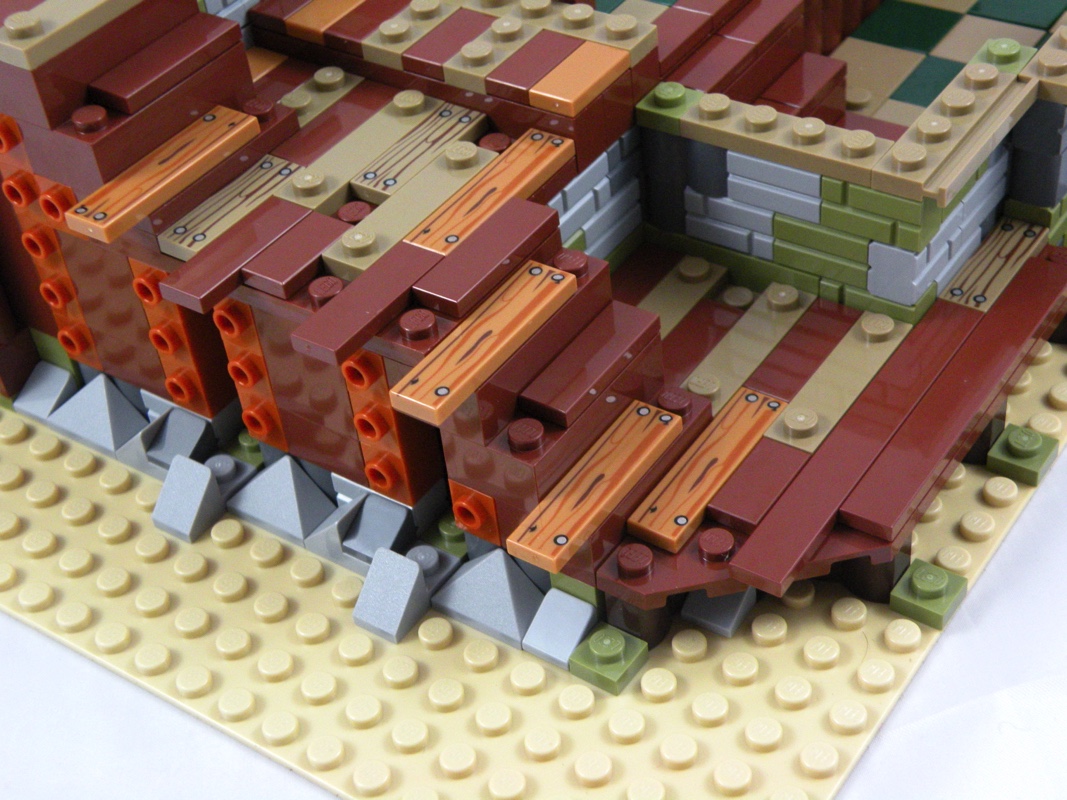 Comme vous avez pu le constater sur les photographies de la boîte, le bâtiment se compose principalement de deux éléments. Le bâtiment principal qui comprend le magasin se situe sur la droite de la tour qui comprend, entre autres, le bureau du capitaine. On commence dans cette étape par assembler le pont, constitué de belles pièces tampographiées façon planches de bois, en dark tan et en medium dark flesh. On s’attelle ensuite au bâtiment principal, en montant quelques murs, une partie des présentoirs, et le sol carrelé dark tan et dark green des deux sous-niveaux qui composent cet intérieur, reliés par un escalier. On assemble également le pont en bois qui entoure la future tour.