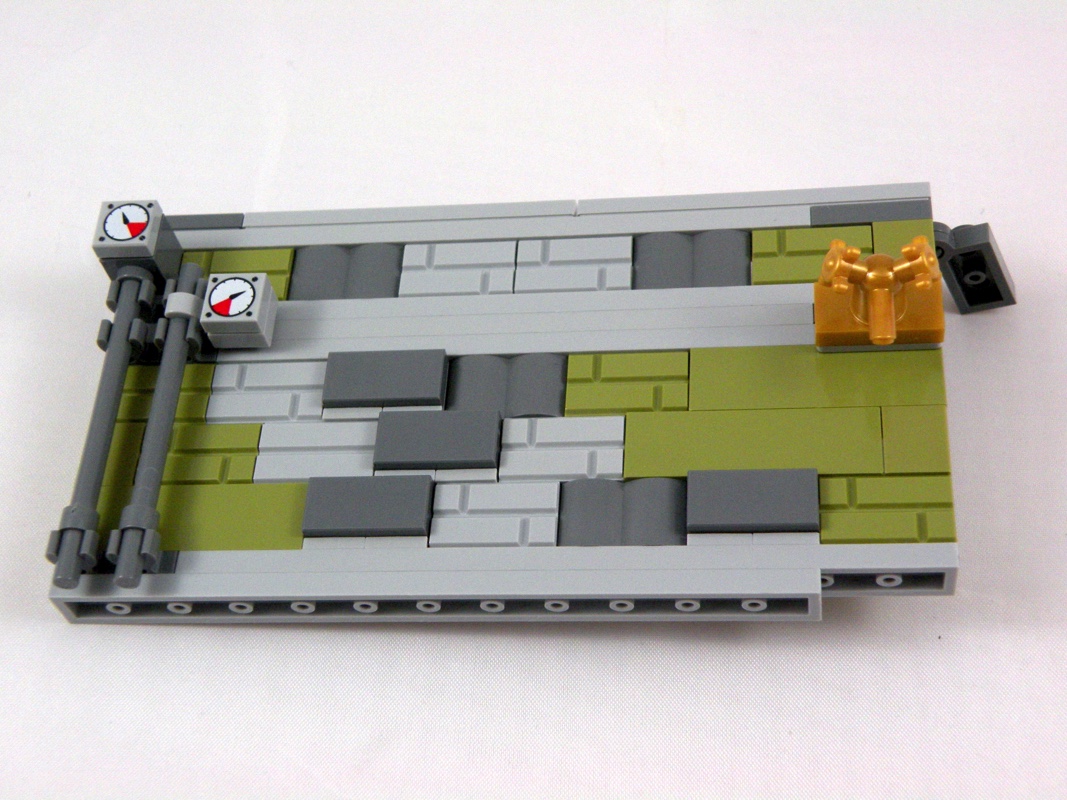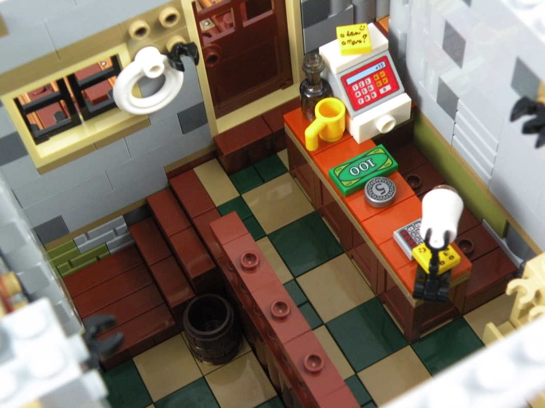 C’est lors de cette étape que l’on commence à aménager l’intérieur du bâtiment principal. On y ajoute notamment le comptoir, avec une couleur dark orange plutôt rare. Les murs commencent à s’élever également, avec l’utilisation de briques SNOT (pour Studs Not On Top), essentiellement en light bluish gray. On ajoute également la porte donnant sur la partie basse du bâtiment, et les fenêtres, tous réalisés à l’aide de cadres couleur tan, plutôt rares (décidément !). Puis vient l’assemblage de la première partie mobile du mur arrière, avec un robinet, quelques tuyaux et des jauges dont il est difficile de déterminer l’utilité.
