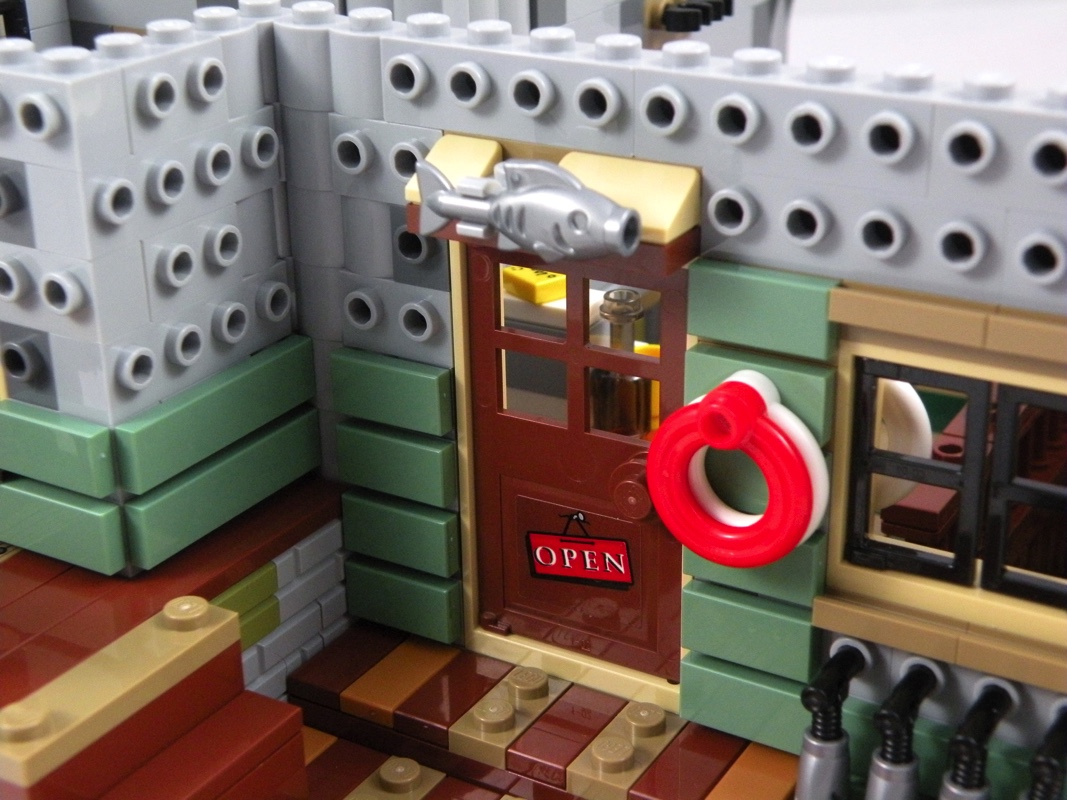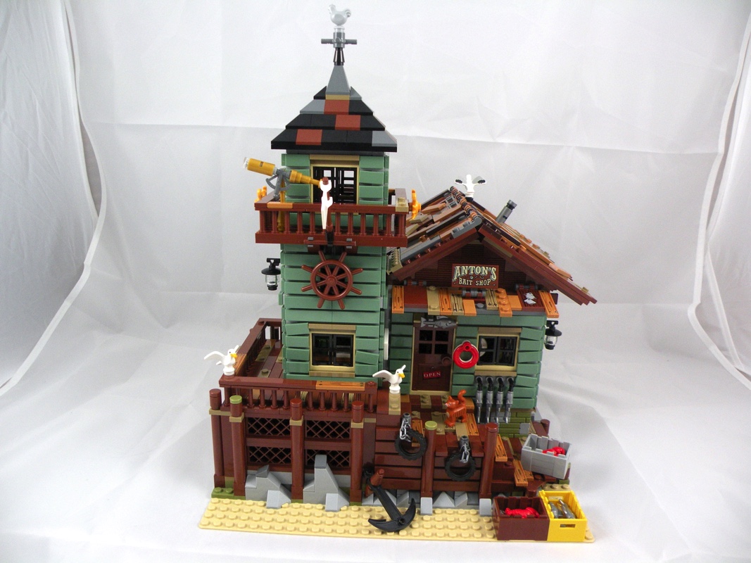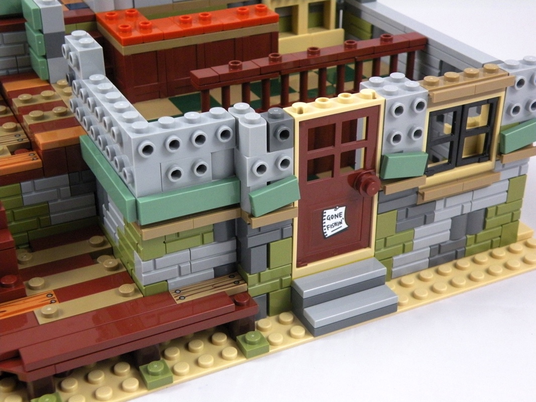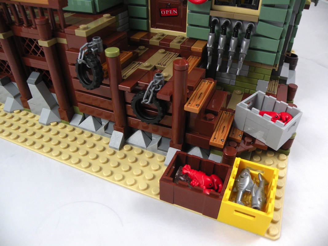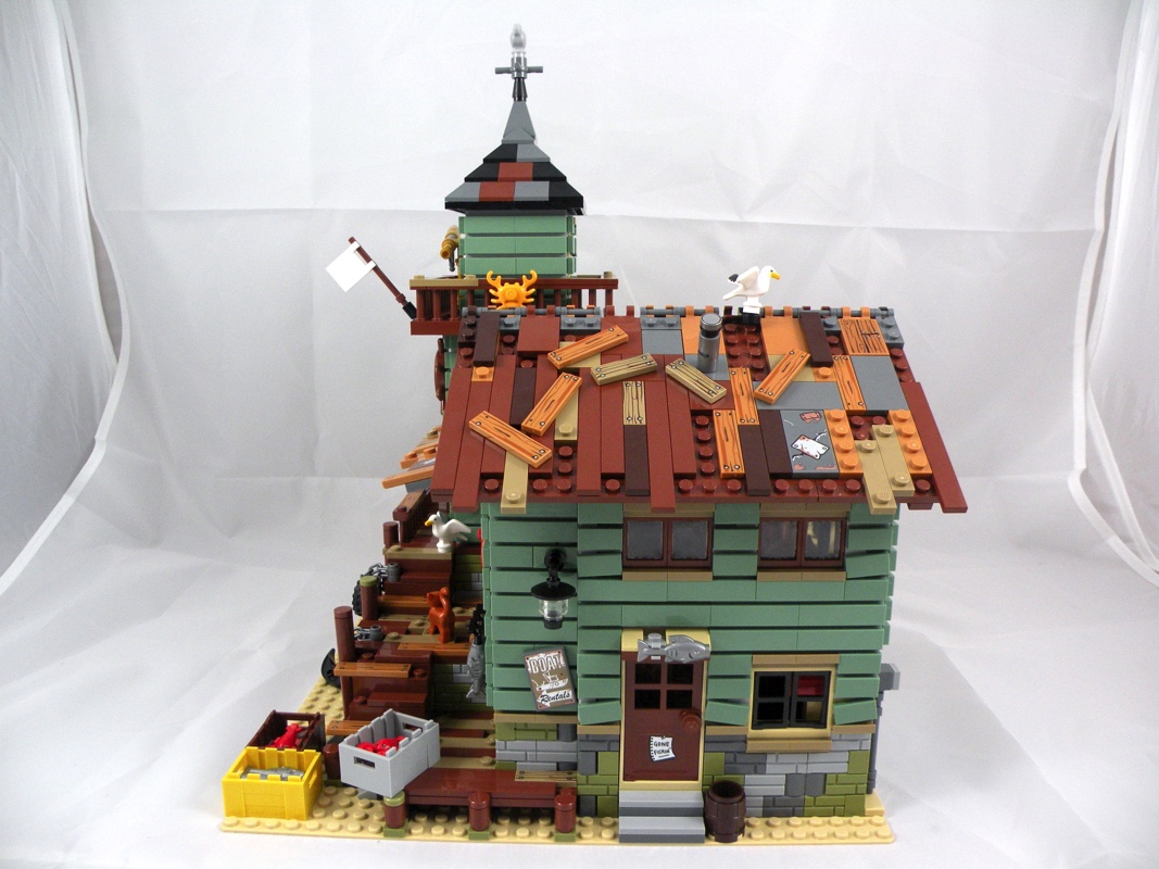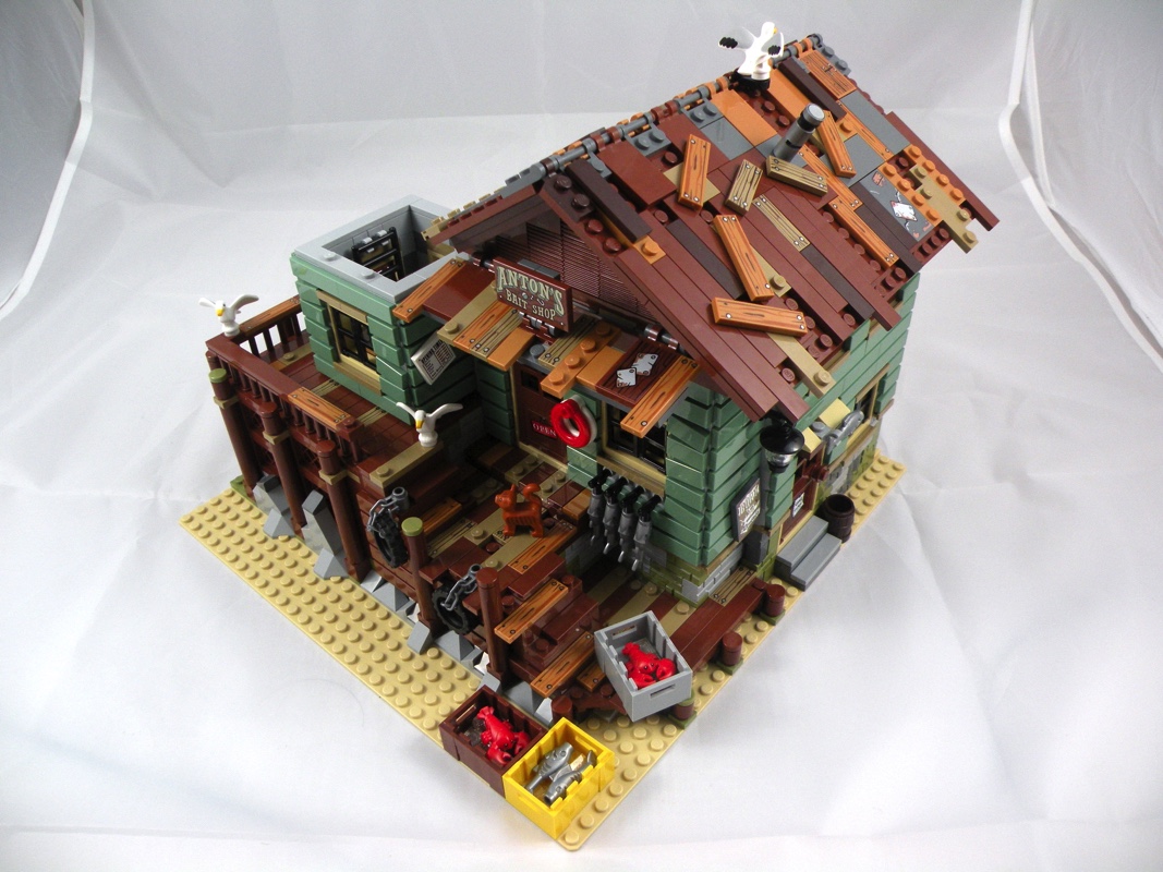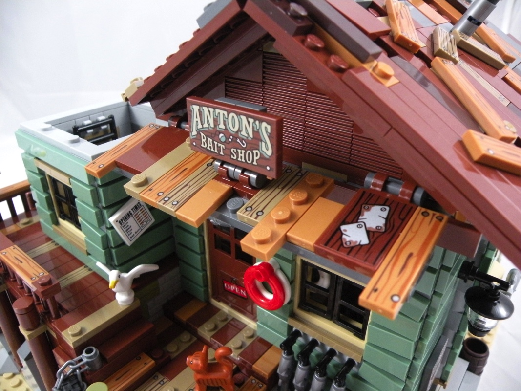 On commence par ajouter le chat, en dark orange, qui fut le héros de la vidéo en mise en ligne par LEGO pour annoncer la tournée de dédicaces. Trois mouettes (jusque-là apparues dans un seul set) prennent également place sur le modèle. On ajoute un auvent de bric et de broc au-dessus de la porte d’entrée, fixé à l’aide de clips, et d’un panneau tampographié mentionnant le nom du magasin : « Anton’s Bait Shop ».