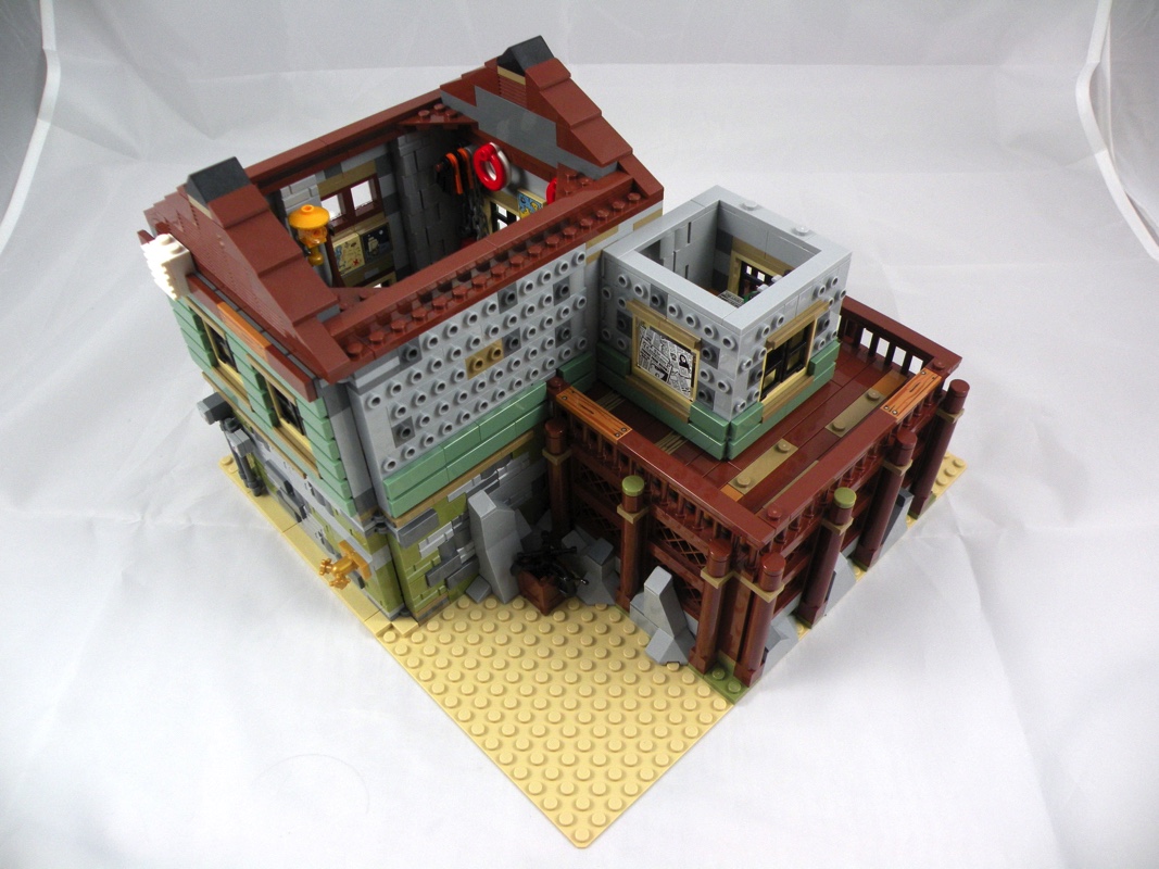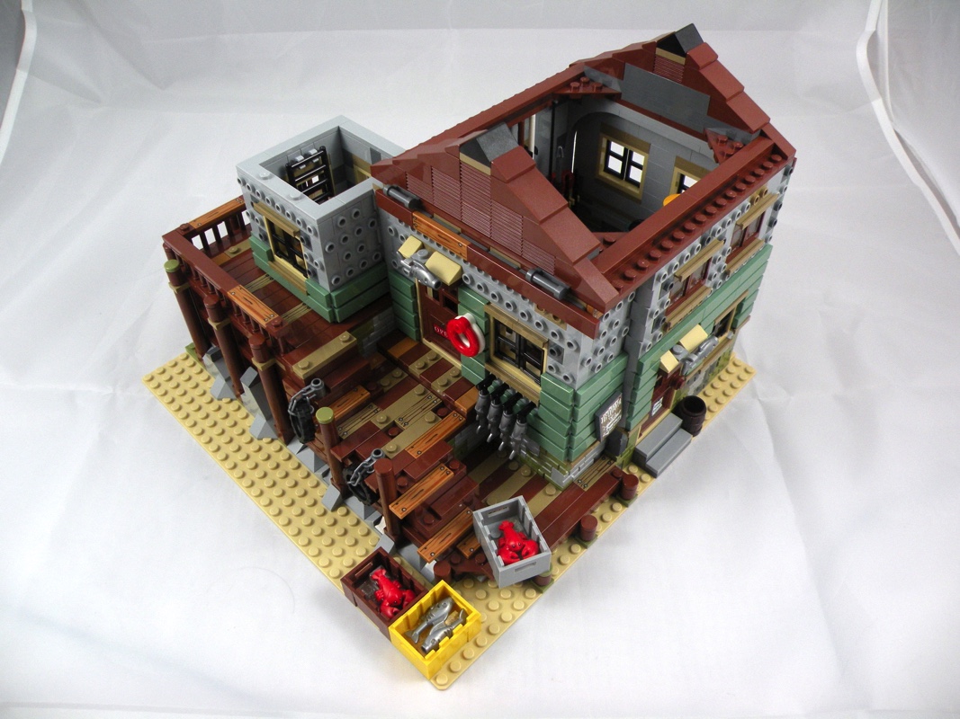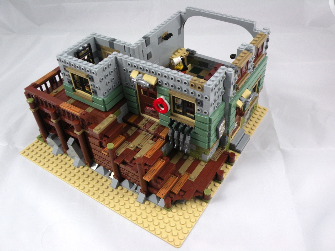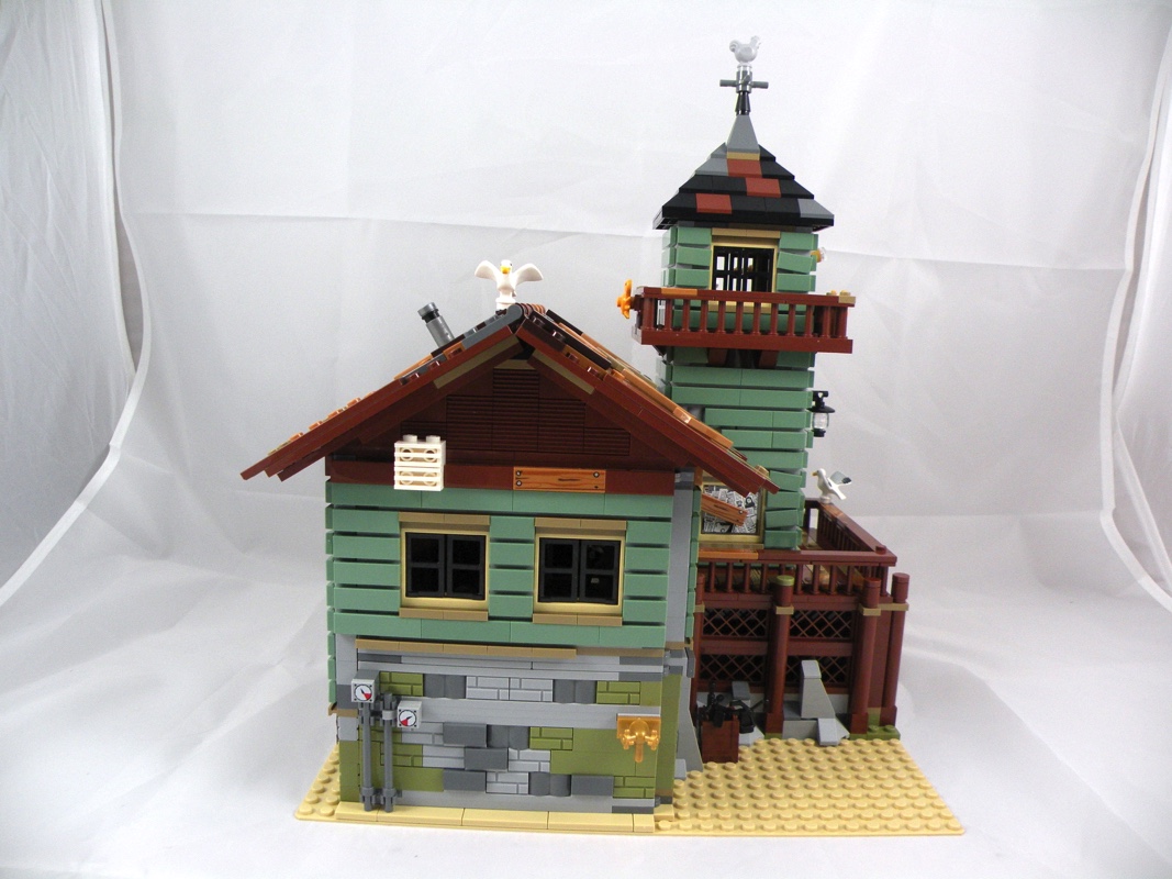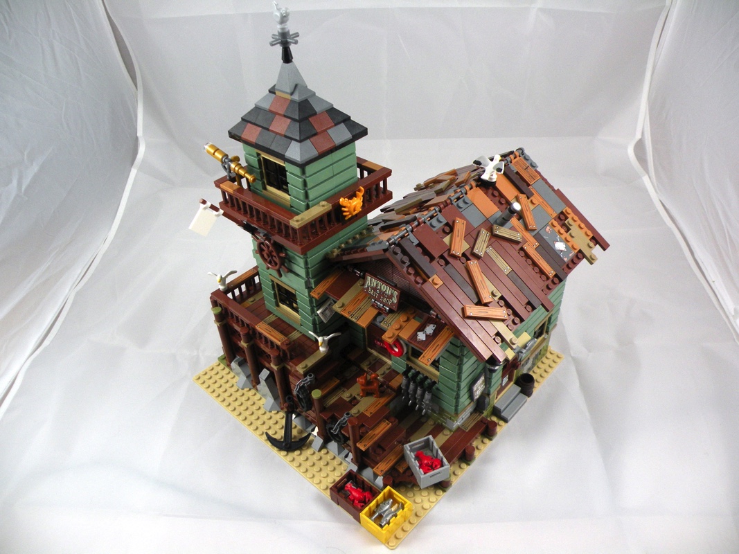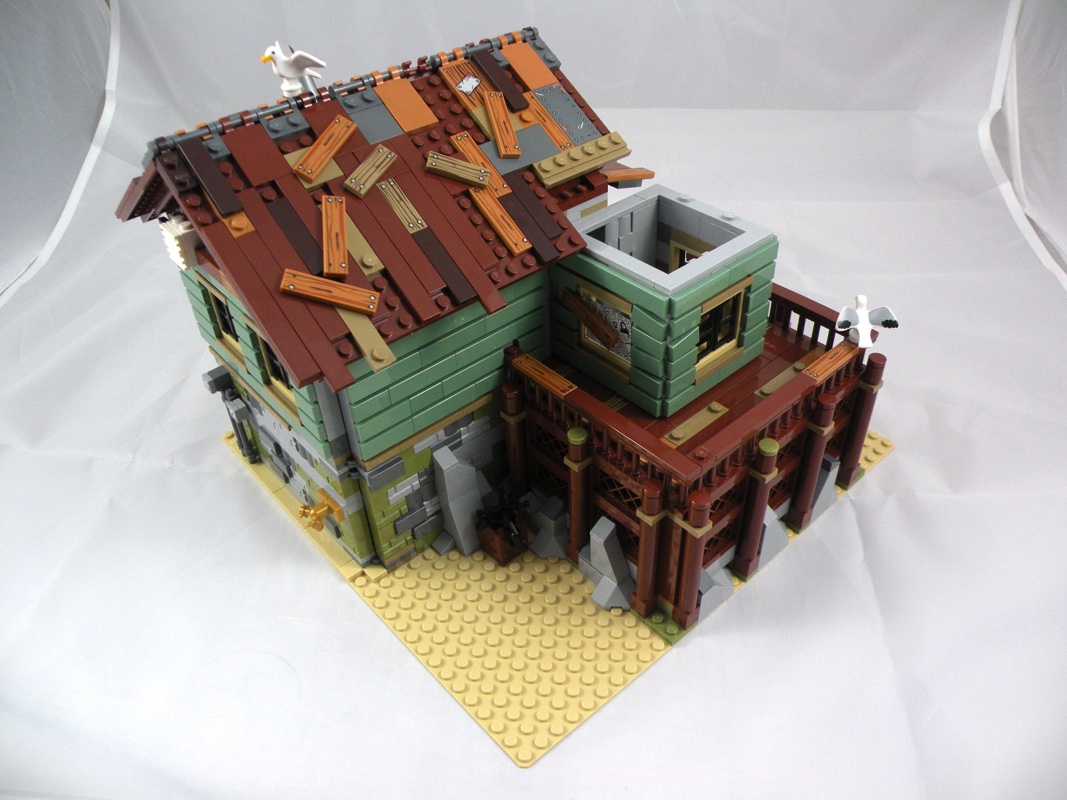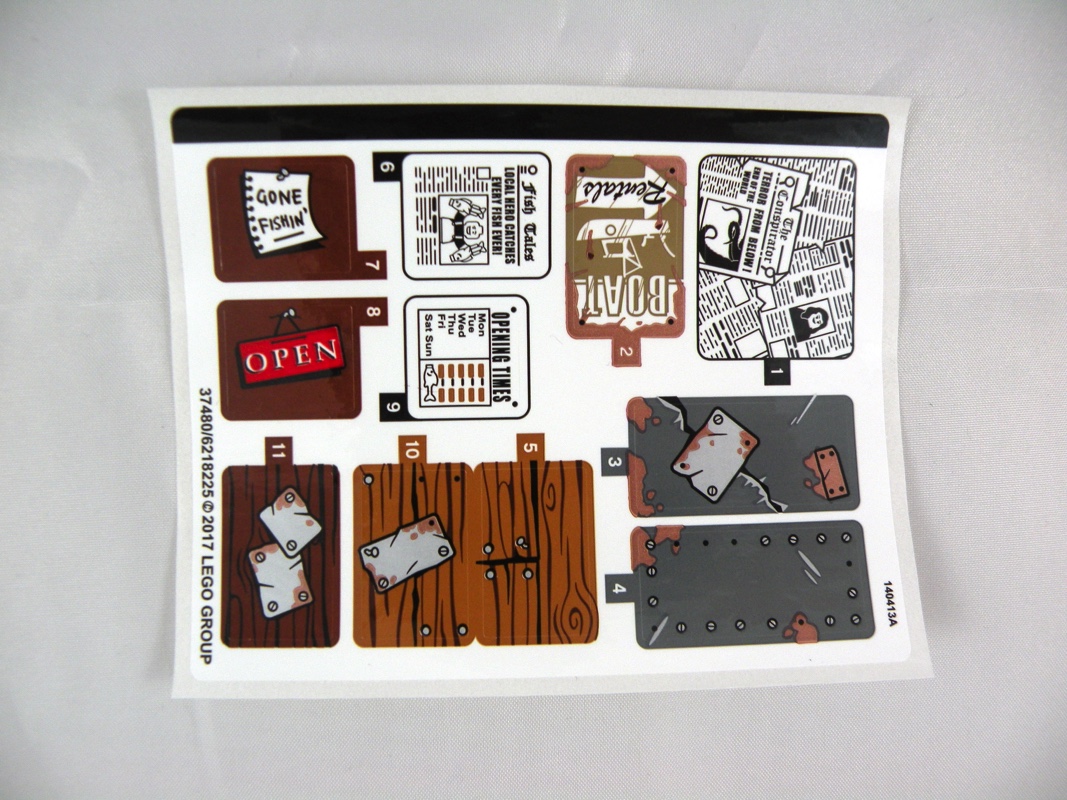 On commence par ajouter le chat, en dark orange, qui fut le héros de la vidéo en mise en ligne par LEGO pour annoncer la tournée de dédicaces. Trois mouettes (jusque-là apparues dans un seul set) prennent également place sur le modèle. On ajoute un auvent de bric et de broc au-dessus de la porte d’entrée, fixé à l’aide de clips, et d’un panneau tampographié mentionnant le nom du magasin : « Anton’s Bait Shop ».