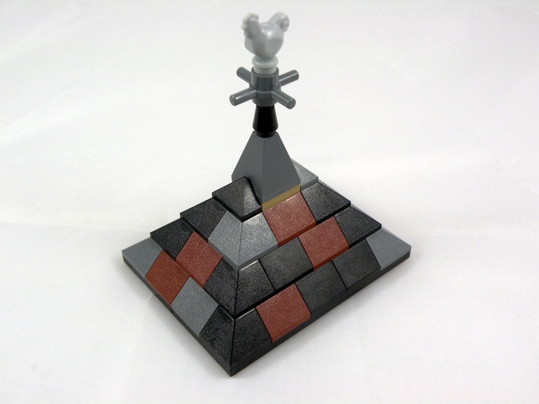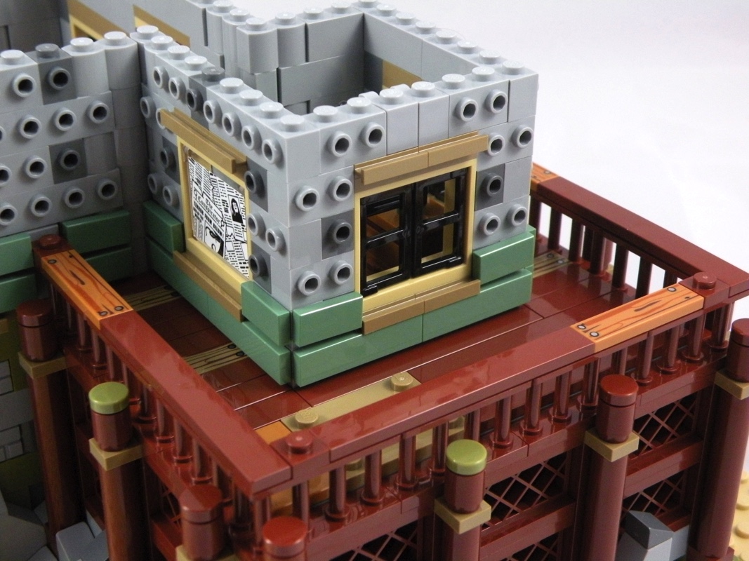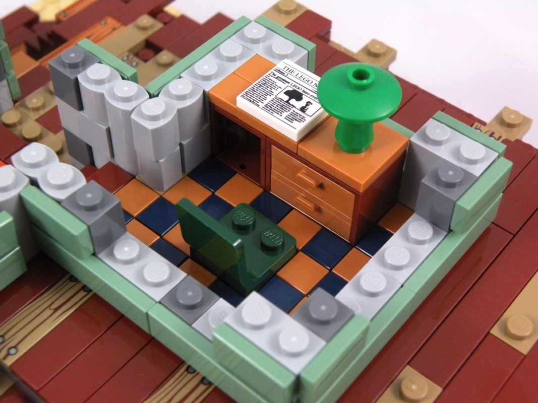 Puis on s’attaque à la partie basse de la tour, à commencer par son pavage à base de tiles 1×1 en dark blue et medium dark flesh. On y ajoute un bureau, avec sa lampe, sa chaise positionnée sur une petite turntable, et son journal tampographié.