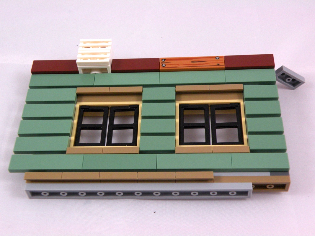 Vient enfin un début d’habillage de l’ensemble, à base de tiles en sand green de dimensions variées (1×2, 1×3 et 1×4). L’aspect sympathique de cette étape réside dans le fait que certaines tiles 1×2 ne prennent place que sur un seul tenon, laissant libre cours au constructeur de l’incliner dans un sens ou dans l’autre, pour renforcé l’aspect « usé par le temps » du bâtiment. Enfin, 4 poissons sont suspendus sous ce qui deviendra une fenêtre dans l’étape suivante, et un autre au-dessus de la première porte en guise d’enseigne.