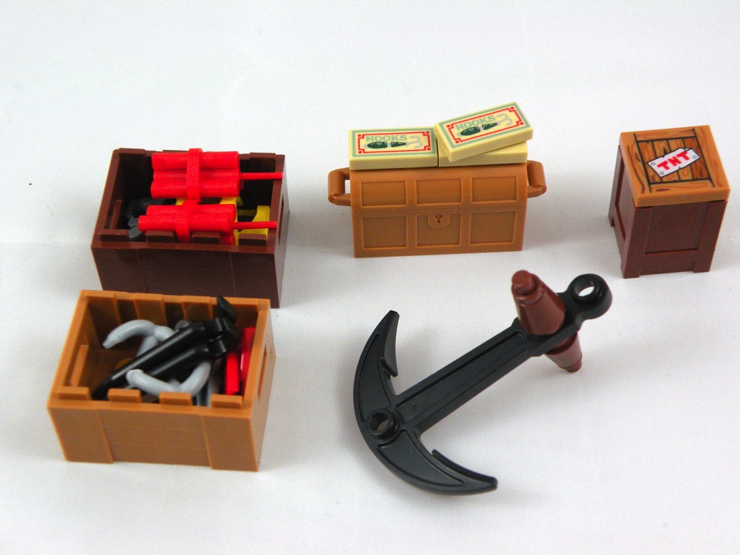 Bien qu’un certain nombre d’entre eux ne seront ajoutés au modèle principal qu’en toute fin de construction, cette étape démarre par l’assemblage de plusieurs accessoires : un coffre avec des outils à l’intérieur et des boîtes d’hameçons sur le dessus, une ancre, une caisse de TNT (tiens, on pêche encore à l’explosif chez LEGO ?!?), et des caisses avec diverses choses, depuis les poissons et les homards sur lit de glace jusqu’aux ciseaux, hameçons et palmes, en passant par… des bâtons de dynamite.